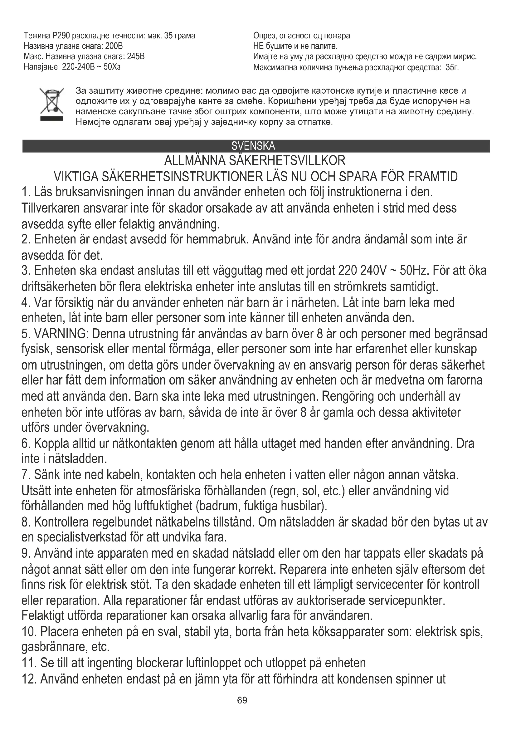 TEKNISK DATA: Avfuktningskapacitet vid 30 ° C / 80% RF): 10 liter / 24 timmar Avfuktningskapacitet vid 27 ° C / 60% RF): 5 liter / 24 timmar Bullernivå: <= 45dB Vattentankens kapacitet: 2,2 liter Luftflöde: 120 m3 / h R290 kylmedelsvikt: max. 35 gram Rattad ingångseffekt: 200W Max. Rattad ingångseffekt: 245W Strömförsörjning: 220-240V ~ 50Hz Vi sköter om miljön. Överlämna förpackningar i kartong till pappersavfall. Polyetylensäckar (PE) slängs i avfallsbehållare för plast. Man bör lämna en gammal apparat till en riktig återvinningscentral, eftersom farliga komponenter i apparaten kan orsaka fara till miljön. En elektrisk apparat bör lämnas för att minska förnyad användning av denna. Om apparaten innehåller batterier, bör man ta bort dem och lämna dem separat till återvinningscentraler. Varning, risk för brand. Gör INTE igenom eller bränna. Var medveten om att köldmediet kanske inte innehåller en lukt. Maximalt köldmediumsbelopp: 35 g.72