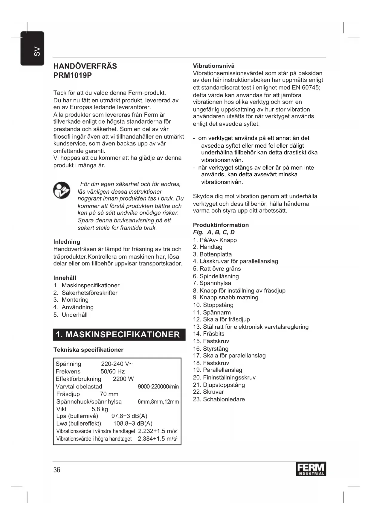 PRM1019P Tack för att du valde denna Ferm-produkt. Du har nu fått en utmärkt produkt, levererad av en av Europas ledande leverantörer. Alla produkter som levereras från Ferm är tillverkade enligt de högsta standarderna för prestanda och säkerhet. Som en del av vår loso ingår även att vi tillhandahåller en utmärkt kundservice, som även backas upp av vår omfattande garanti. Vi hoppas att du kommer att ha glädje av denna produkt i många år. För din egen säkerhet och för andras, läs vänligen dessa instruktioner noggrant innan produkten tas i bruk. Du kommer att förstå produkten bättre och kan på så sätt undvika onödiga risker. Spara denna bruksanvisning på ett säkert ställe för framtida bruk. Inledning Handöverfräsen är lämpd för fräsning av trä och träprodukter.Kontrollera om maskinen har, lösa delar eller om tillbehör uppvisar transportskador. Innehåll