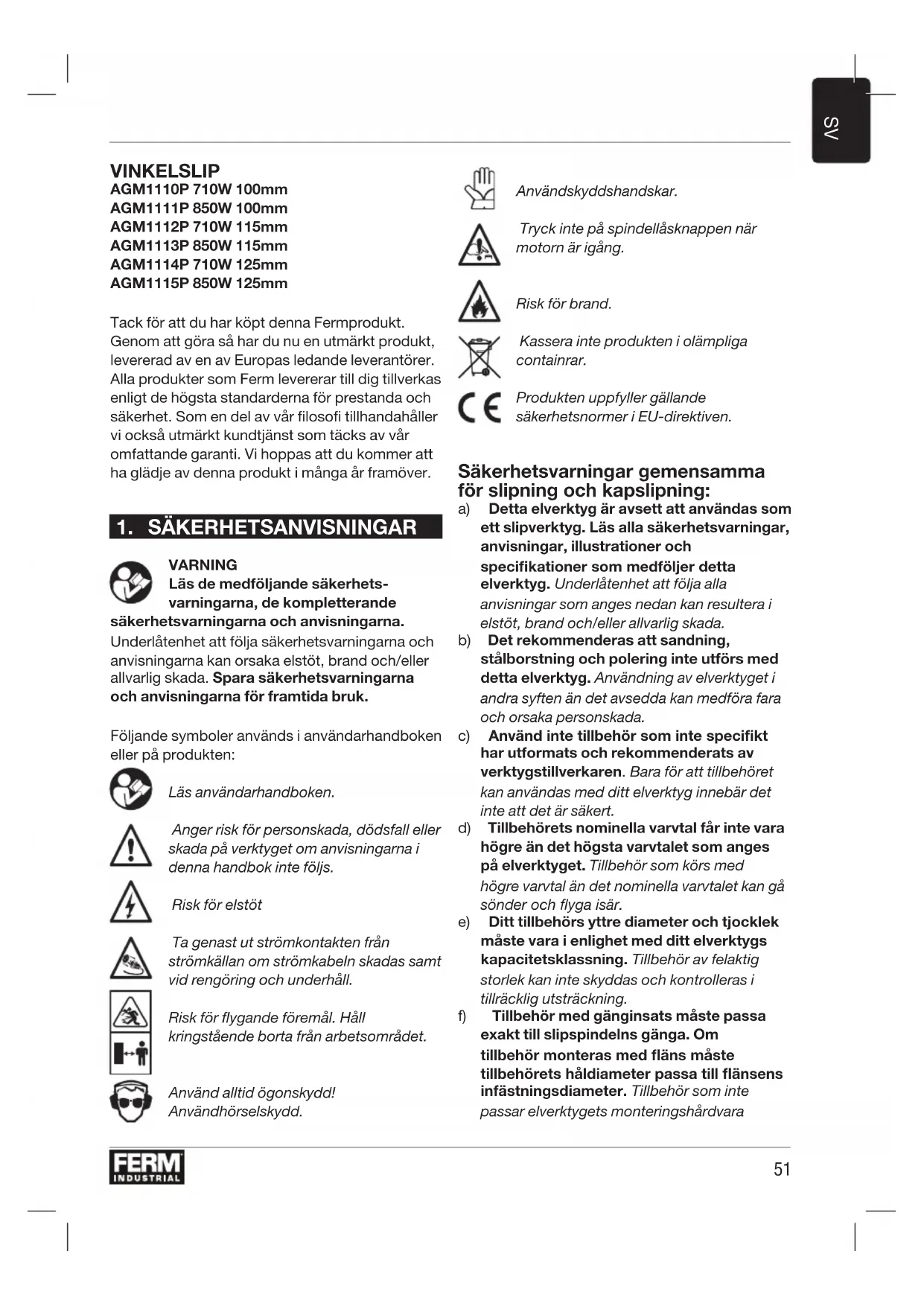 VINKELSLIP AGM1110P 710W 100mm AGM1111P 850W 100mm AGM1112P 710W 115mm AGM1113P 850W 115mm AGM1114P 710W 125mm AGM1115P 850W 125mm Tack för att du har köpt denna Fermprodukt. Genom att göra så har du nu en utmärkt produkt, levererad av en av Europas ledande leverantörer. Alla produkter som Ferm levererar till dig tillverkas enligt de högsta standarderna för prestanda och säkerhet. Som en del av vår filosofi tillhandahåller vi också utmärkt kundtjänst som täcks av vår omfattande garanti. Vi hoppas att du kommer att ha glädje av denna produkt i många år framöver.