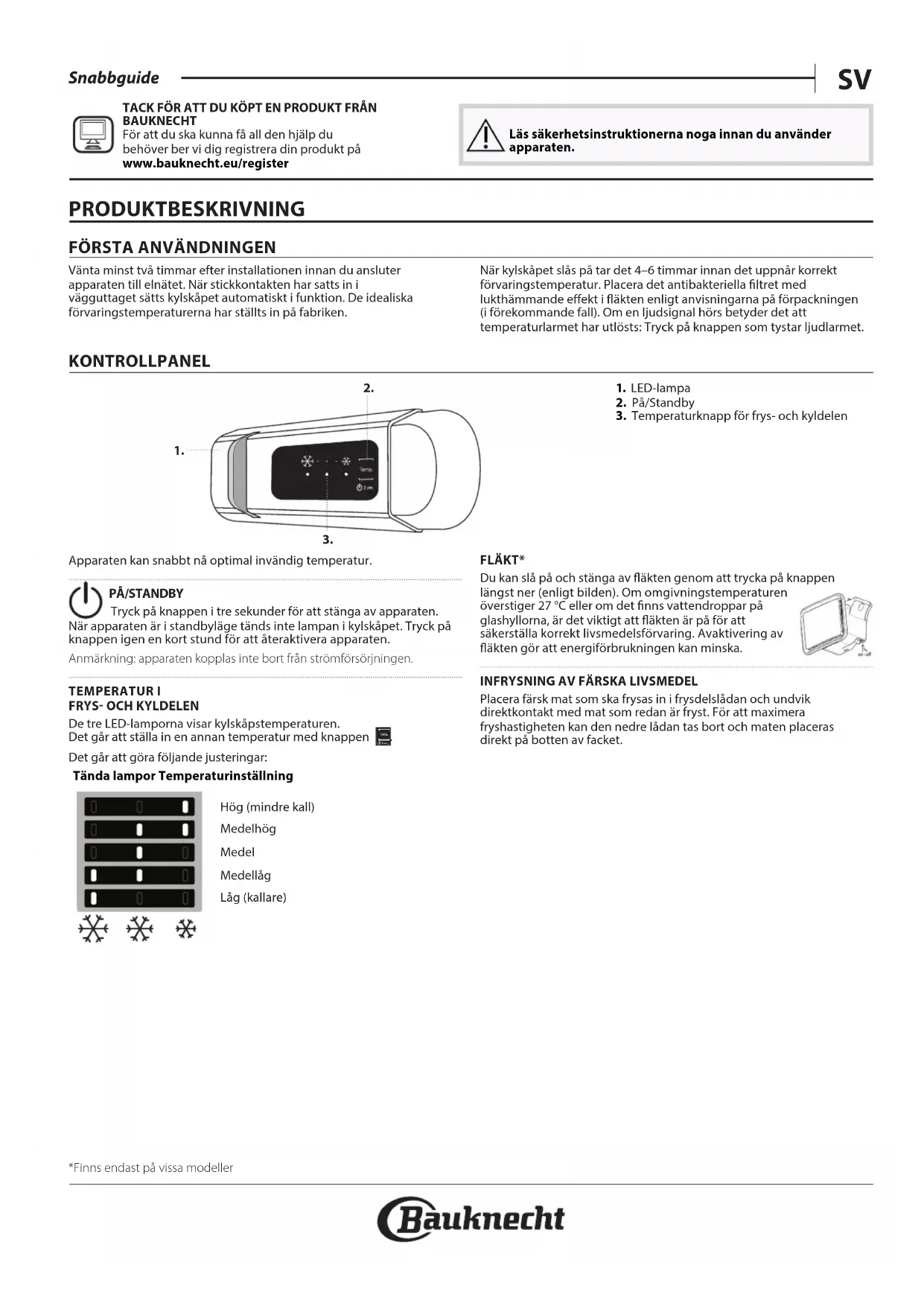 - Slå av viften (hvis denne nnes) ved å følge prosedyren beskrevet i avsnittet “VIFTE”.SV Snabbguide TACK FÖR ATT DU KÖPT EN PRODUKT FRÅN BAUKNECHT För att du ska kunna få all den hjälp du behöver ber vi dig registrera din produkt på www . bauknecht . eu / register Läs säkerhetsinstruktionerna noga innan du använder apparaten. PRODUKTBESKRIVNING