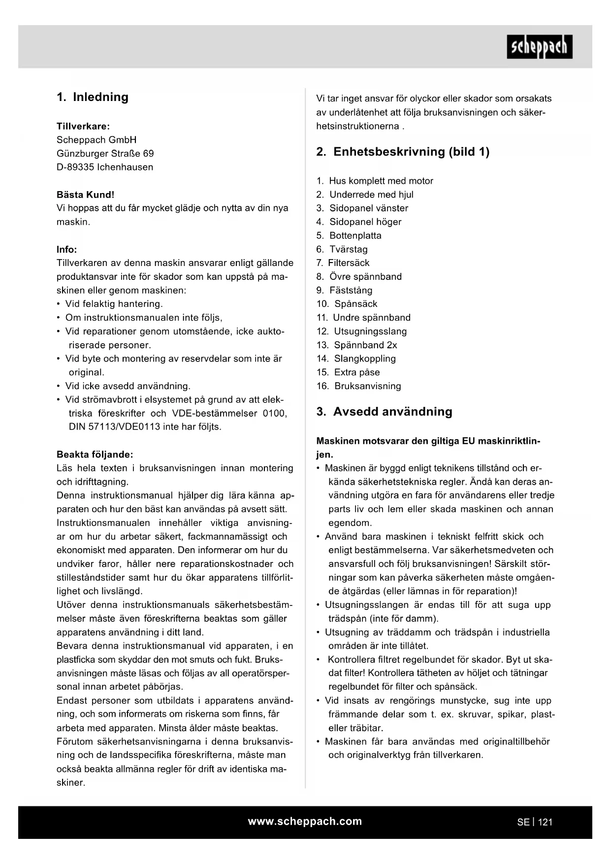 Tillverkare: Scheppach GmbH Günzburger Straße 69 D-89335 Ichenhausen Bästa Kund! Vi hoppas att du får mycket glädje och nytta av din nya maskin. Info: Tillverkaren av denna maskin ansvarar enligt gällande produktansvar inte för skador som kan uppstå på ma- skinen eller genom maskinen: