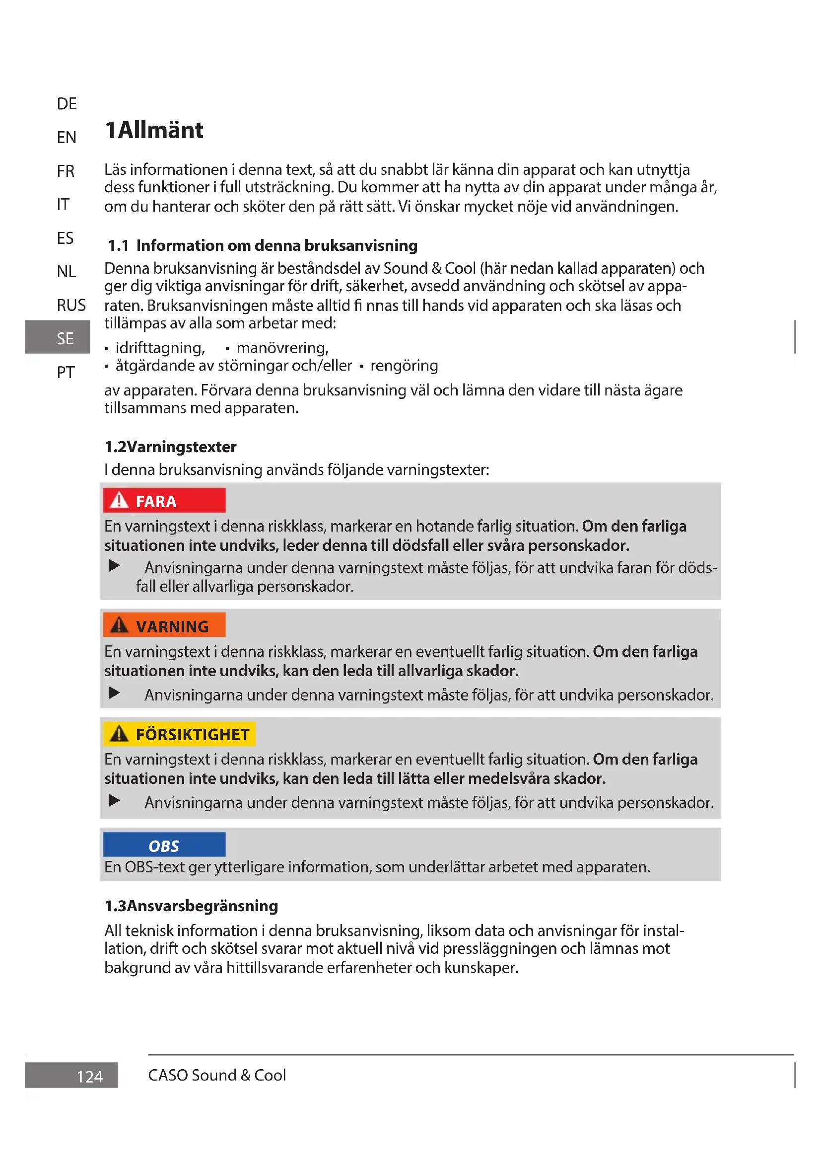 OBS För säkert arbete med apparaten ska nedanstående allmänna säkerhetsanvisningar följas: Kontrollera apparaten före användning med avseende på utif- rån synliga skador. Ta inte en skadad apparat i drift. Om elanslutningskabeln till denna enhet skadas måste den bytas ut av tillverkaren resp. tillverkarens kundtjänst eller en liknande kvali cerad person för att undvika faror. Denna enhet får användas av personer med nedsatt fysisk, sensorisk eller mental förmåga eller brist på erfarenhet och kunskap om de är under tillsyn eller har instruerats avseende den säkra hanteringen av enheten och förstått de därmed inneboende farorna. Rengöring och skötsel från användarens sida får inte utföras av barn. Barn får inte leka med apparaten. Barn får inte leka med apparaten. Apparaten och dess nätkabel måste hållas på avstånd från barn yngre än 8 år. Genomför inga förändringar på enheten eller på elkabeln. Låt endast en fackverkstad genomföra reparationer, eftersom osakkunnigt reparerade enheter kan utgöra faror för använda- ren. Observera även de bifogade garantivillkoren. Defekta komponenter får enbart bytas ut mot originalreserv- delar. Enbart med sådana delar, garanteras att säkerhetskra- ven uppfylls. Dra ut lådorna med de infällda greppen. Akta på ngrarna så att de inte kommer i kläm mellan lådorna och enheten. Eluttaget ska vara fritt åtkomligt ifall enheten måste snabbt kopplas loss från elnätet.CASO Sound & Cool