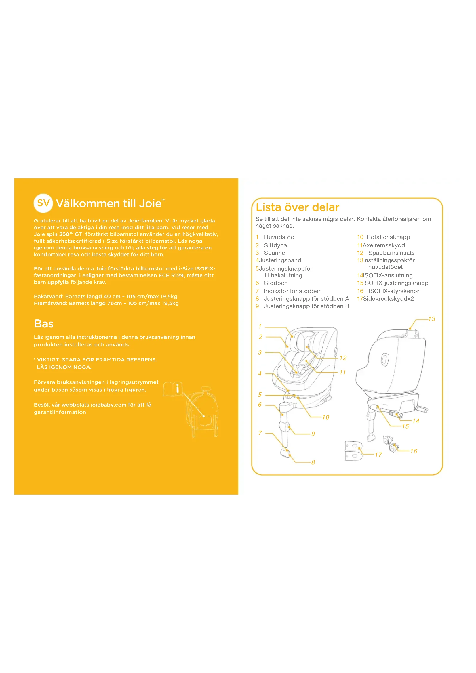 Gratulerar till att ha blivit en del av Joie-familjen! Vi är mycket glada över att vara delaktiga i din resa med ditt lilla barn. Vid resor med Joie spin 360™ GTi förstärkt bilbarnstol använder du en högkvalitativ, fullt säkerhetscertifierad i-Size förstärkt bilbarnstol. Läs noga igenom denna bruksanvisning och följ alla steg för att garantera en komfortabel resa och bästa skyddet för ditt barn.För att använda denna Joie förstärkta bilbarnstol med i-Size ISOFIX-fästanordningar, i enlighet med bestämmelsen ECE R129, måste ditt barn uppfylla följande krav.Bakåtvänd: Barnets längd 40cm – 105cm/max19,5kgFramåtvänd: Barnets längd 76cm – 105cm/max19,5kg Bas Läs igenom alla instruktionerna i denna bruksanvisning innan produkten installeras och används.! VIKTIGT: SPARA FÖR FRAMTIDA REFERENS.LÄS IGENOM NOGA.Förvara bruksanvisningen i lagringsutrymmet under basen såsom visas i högra figuren.Besök vår webbplats joiebaby.com för att få garantiinformation Lista över delar 1 Huvudstöd2 Sittdyna3 Spänne4 Justeringsband5 Justeringsknapp för tillbakalutning6 Stödben7 Indikator för stödben8 Justeringsknapp för stödben A9 Justeringsknapp för stödben B10 Rotationsknapp11 Axelremsskydd12 Spädbarnsinsats 13 Inställningsspak för huvudstödet14 ISOFIX-anslutning15 ISOFIX-justeringsknapp16 ISOFIX-styrskenor17 Sidokrockskydd x2Se till att det inte saknas några delar. Kontakta återförsäljaren om något saknas.