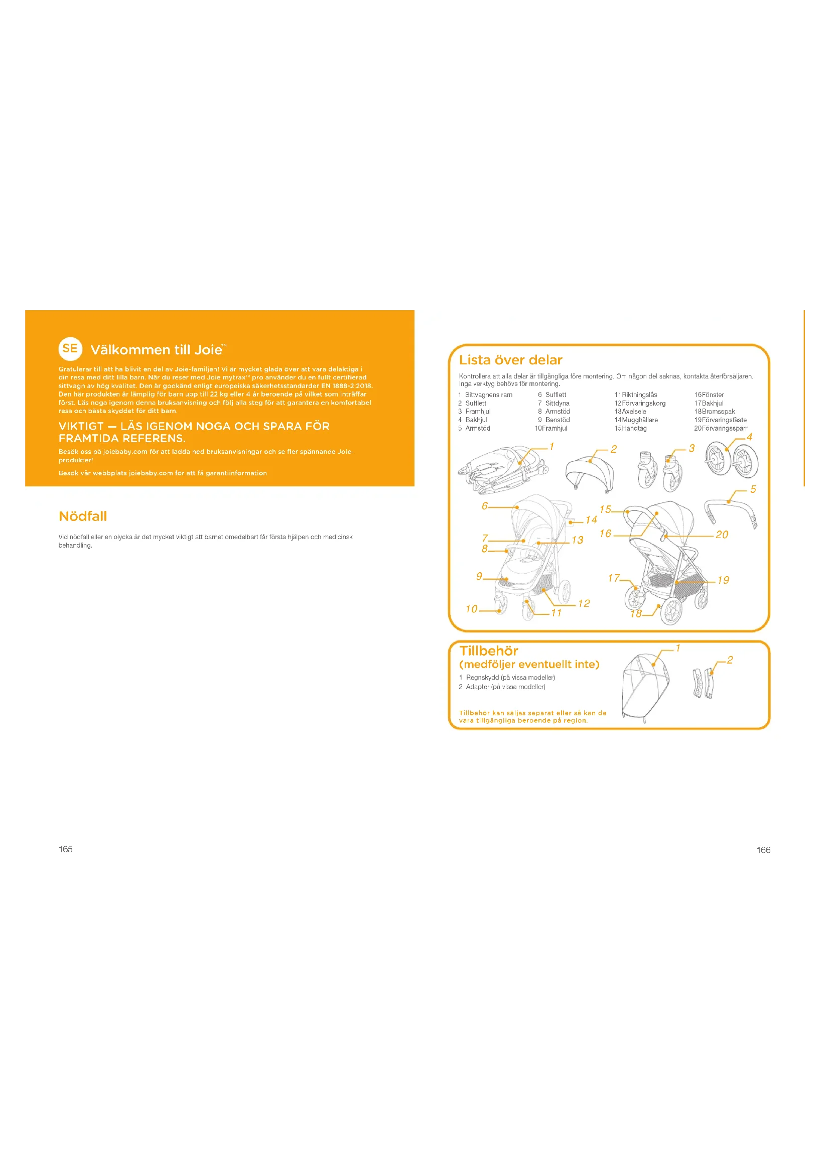Gratulerar till att ha blivit en del av Joie-familjen! Vi är mycket glada över att vara delaktiga i din resa med ditt lilla barn. När du reser med Joie mytrax™ pro använder du en fullt certifierad sittvagn av hög kvalitet. Den är godkänd enligt europeiska säkerhetsstandarder EN1888-2:2018. Den här produkten är lämplig för barn upp till 22kg eller 4år beroende på vilket som inträffar först. Läs noga igenom denna bruksanvisning och följ alla steg för att garantera en komfortabel resa och bästa skyddet för ditt barn. VIKTIGT — LÄS IGENOM NOGA OCH SPARA FÖR FRAMTIDA REFERENS. Besök oss på joiebaby.com för att ladda ned bruksanvisningar och se fler spännande Joie-produkter!Besök vår webbplats joiebaby.com för att få garantiinformation Nödfall Vid nödfall eller en olycka är det mycket viktigt att barnet omedelbart får första hjälpen och medicinsk behandling.