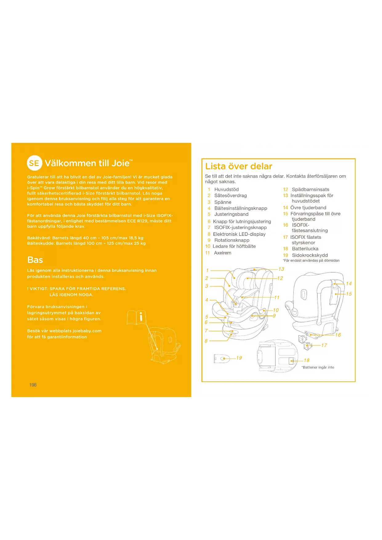 Gratulerar till att ha blivit en del av Joie-familjen! Vi är mycket glada över att vara delaktiga i din resa med ditt lilla barn. Vid resor med i-Spin™ Grow förstärkt bilbarnstol använder du en högkvalitativ, fullt säkerhetscertifierad i-Size förstärkt bilbarnstol. Läs noga igenom denna bruksanvisning och följ alla steg för att garantera en komfortabel resa och bästa skyddet för ditt barn.För att använda denna Joie förstärkta bilbarnstol med i-Size ISOFIX-fästanordningar, i enlighet med bestämmelsen ECE R129, måste ditt barn uppfylla följande krav.Bakåtvänd: Barnets längd 40cm – 105cm/max18,5 kgBälteskudde: Barnets längd 100cm – 125cm/max25 kg Bas Läs igenom alla instruktionerna i denna bruksanvisning innan produkten installeras och används.! VIKTIGT: SPARA FÖR FRAMTIDA REFERENS.LÄS IGENOM NOGA.Förvara bruksanvisningen i lagringsutrymmet på baksidan av sätet såsom visas i högra figuren.Besök vår webbplats joiebaby.com för att få garantiinformation Lista över delar 1 Huvudstöd 2 Sätesöverdrag 3 Spänne 4 Bältesinställningsknapp 5 Justeringsband 6 Knapp för lutningsjustering 7 ISOFIX-justeringsknapp 8 Elektronisk LED-display 9 Rotationsknapp10 Ledare för höftbälte11 Axelrem12 Spädbarnsinsats13 Inställningsspak för huvudstödet14 Övre tjuderband15 Förvaringspåse till övre tjuderband16 ISOFIX-fästesanslutning17 ISOFIX fästets styrskenor 18 Batterilucka19 SidokrockskyddSe till att det inte saknas några delar. Kontakta återförsäljaren om något saknas.