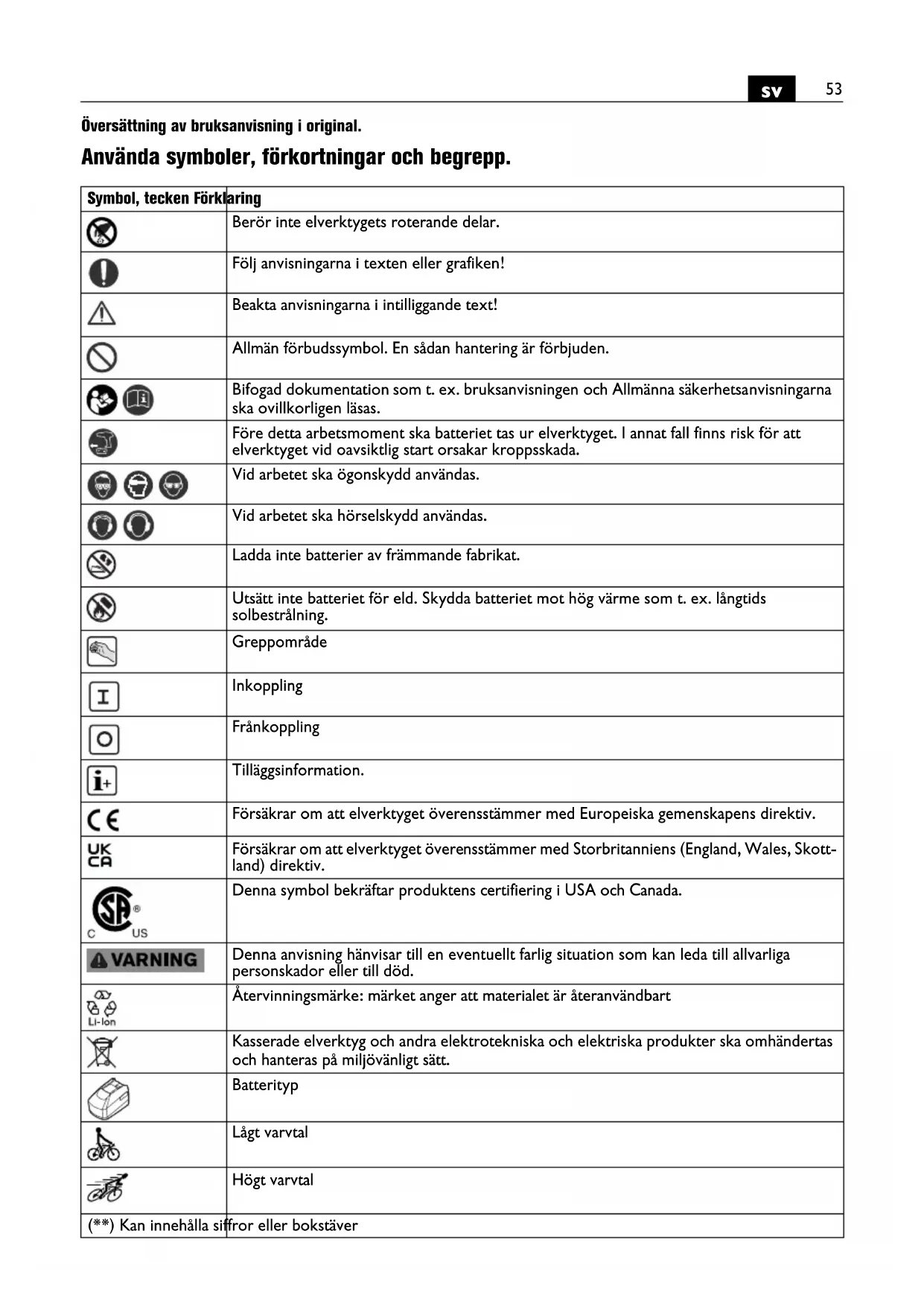 Översättning av bruksanvisning i original. Använda symboler, förkortningar och begrepp. Symbol, tecken Förklaring Berör inte elverktygets roterande delar. Följ anvisningarna i texten eller grafiken! Beakta anvisningarna i intilliggande text! Allmän förbudssymbol. En sådan hantering är förbjuden. Bifogad dokumentation som t. ex. bruksanvisningen och Allmänna säkerhetsanvisningarna ska ovillkorligen läsas. Före detta arbetsmoment ska batteriet tas ur elverktyget. I annat fall finns risk för att elverktyget vid oavsiktlig start orsakar kroppsskada. Vid arbetet ska ögonskydd användas. Vid arbetet ska hörselskydd användas. Ladda inte batterier av främmande fabrikat. Utsätt inte batteriet för eld. Skydda batteriet mot hög värme som t. ex. långtids solbestrålning. Greppområde Inkoppling Frånkoppling Tilläggsinformation. Försäkrar om att elverktyget överensstämmer med Europeiska gemenskapens direktiv. Försäkrar om att elverktyget överensstämmer med Storbritanniens (England, Wales, Skott- land) direktiv. Denna symbol bekräftar produktens certifiering i USA och Canada. Denna anvisning hänvisar till en eventuellt farlig situation som kan leda till allvarliga personskador eller till död. Återvinningsmärke: märket anger att materialet är återanvändbart Kasserade elverktyg och andra elektrotekniska och elektriska produkter ska omhändertas och hanteras på miljövänligt sätt. Batterityp Lågt varvtal Högt varvtal (**) Kan innehålla siffror eller bokstäver54