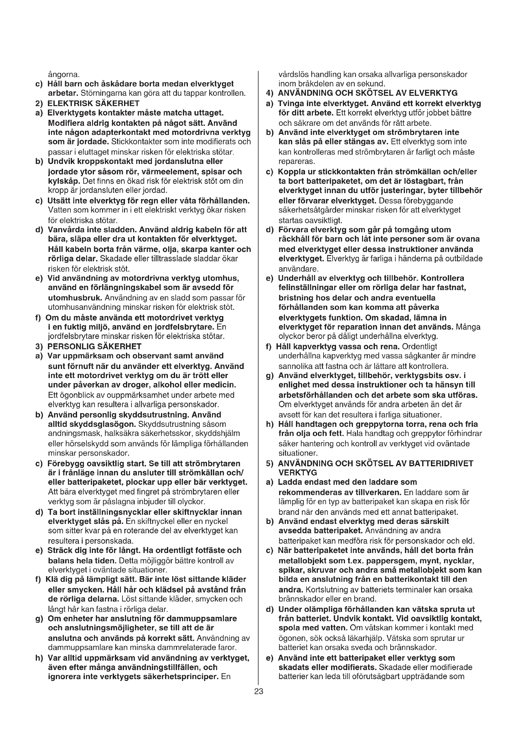 a) Var uppmärksam och observant samt använd sunt förnuft när du använder ett elverktyg. Använd inte ett motordrivet verktyg om du är trött eller under påverkan av droger, alkohol eller medicin. Ett ögonblick av ouppmärksamhet under arbete med elverktyg kan resultera i allvarliga personskador. b) Använd personlig skyddsutrustning. Använd alltid skyddsglasögon. Skyddsutrustning såsom andningsmask, halksäkra säkerhetsskor, skyddshjälm eller hörselskydd som används för lämpliga förhållanden minskar personskador. c) Förebygg oavsiktlig start. Se till att strömbrytaren är i frånläge innan du ansluter till strömkällan och/ eller batteripaketet, plockar upp eller bär verktyget. Att bära elverktyget med ngret på strömbrytaren eller verktyg som är påslagna inbjuder till olyckor. d) Ta bort inställningsnycklar eller skiftnycklar innan elverktyget slås på. En skiftnyckel eller en nyckel som sitter kvar på en roterande del av elverktyget kan resultera i personskada. e) Sträck dig inte för långt. Ha ordentligt fotfäste och balans hela tiden. Detta möjliggör bättre kontroll av elverktyget i oväntade situationer. f) Klä dig på lämpligt sätt. Bär inte löst sittande kläder eller smycken. Håll hår och klädsel på avstånd från de rörliga delarna. Löst sittande kläder, smycken och långt hår kan fastna i rörliga delar. g) Om enheter har anslutning för dammuppsamlare och anslutningsmöjligheter, se till att de är anslutna och används på korrekt sätt. Användning av dammuppsamlare kan minska dammrelaterade faror. h) Var alltid uppmärksam vid användning av verktyget, även efter många användningstillfällen, och ignorera inte verktygets säkerhetsprinciper. En24 leda till explosion; borrning i vattenledning kan förorsaka egendomsskador eller elstöt) BATTERIER