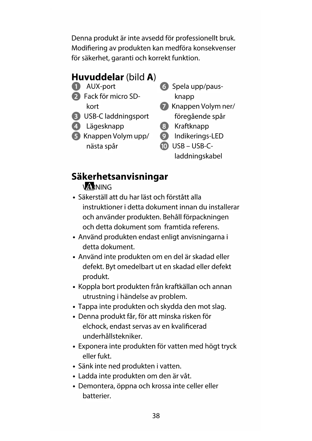 Snabbstartsguide Bluetooth®-högtalare SPBT3600BK För ytterligare information, se den utökade manualen online: ned.is/spbt3600bk Avsedd användning Denna produkt är avsedd för att strömma ljud från din mediaenhet via Bluetooth®, en ljudkabel eller från ett microSD-kort. Produkten är avsedd för användning inomhus och utomhus.38 Denna produkt är inte avsedd för professionellt bruk. Modiering av produkten kan medföra konsekvenser för säkerhet, garanti och korrekt funktion. Huvuddelar (bild A) 1 AUX-port 2 Fack för micro SD- kort 3 USB-C laddningsport 4 Lägesknapp 5 Knappen Volym upp/ nästa spår 6 Spela upp/paus- knapp 7 Knappen Volym ner/ föregående spår 8 Kraftknapp 9 Indikerings-LED q USB – USB-C- laddningskabel Säkerhetsanvisningar