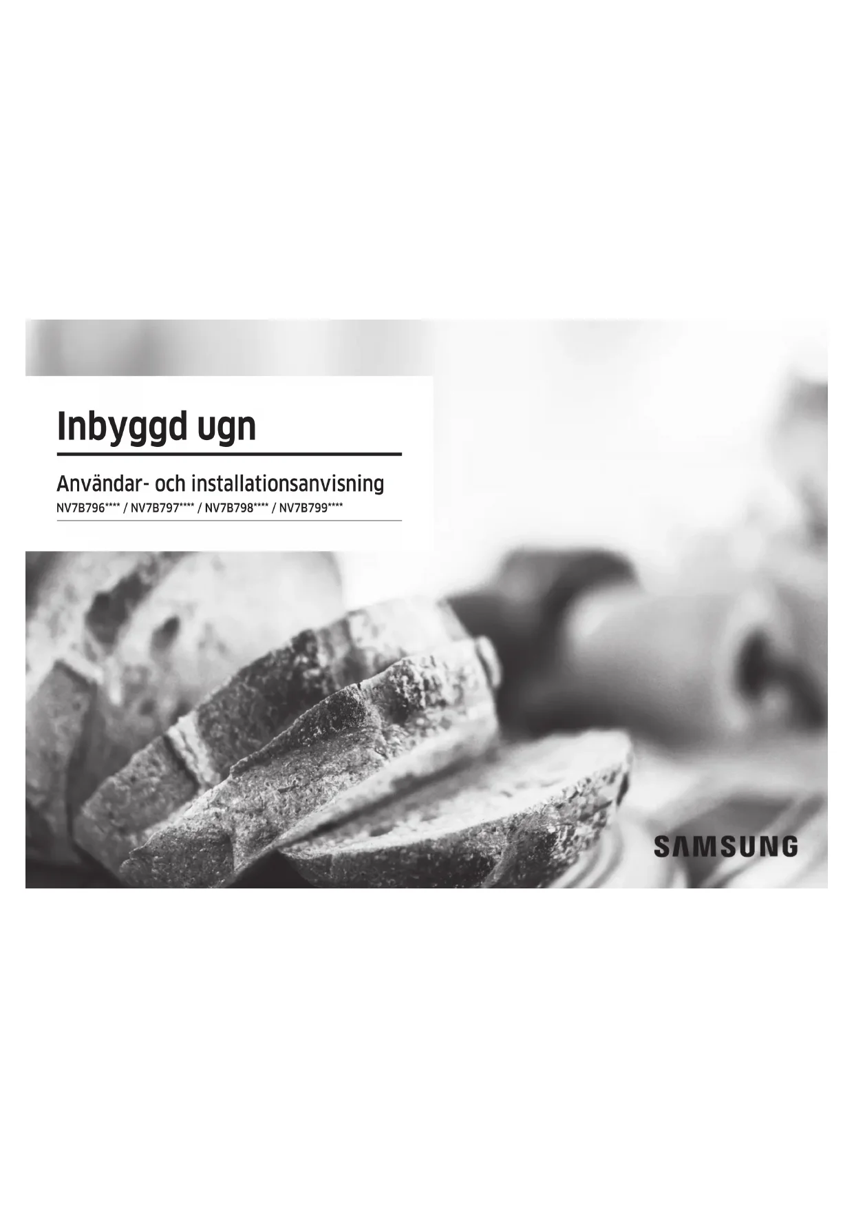 - (opłata według taryfy operatora) http://www.samsung.com/pl/support/ ROMANIA 0800872678 - Apel gratuit *8000 - Apel tarifat în reţea Program Call Center Luni - Vineri: 9 AM - 6 PM www.samsung.com/ro/support SERBIA 011 321 6899 www.samsung.com/rs/support SLOVAKIA 0800 - SAMSUNG (0800-726 786) www.samsung.com/sk/support LITHUANIA 8-800-77777 www.samsung.com/lt/support LATVIA 8000-7267 www.samsung.com/lv/support ESTONIA 800-7267 www.samsung.com/ee/support SLOVENIA 080 697 267 (brezplačna številka) www.samsung.com/si/support KOSOVO 038 40 30 90 www.samsung.com/support VRAGEN OF OPMERKINGEN? DG68-01472A-01Inbyggd ugn Användar- och installationsanvisning NV7B796**** / NV7B797**** / NV7B798**** / NV7B799****2 Svenska Innehåll Hälsosam tillagning 30 Automatisk tillagning 30 Timer 31 Rengöring 32 Inställningar 34 Lås 35 Smart tillagning 36 Manuell tillagning 36 Program för automatisk tillagning 44 Specialfunktion 52 Testrätter 53 Samling av vardagliga Auto Cook-recept 54 Underhåll 57 Rengöring 57 Öppnar luckan automatiskt 60 Utbyten 61 Problemlösning 62 Kontrollpunkter 62 Informationskoder 64 Tekniska specikationer 65 Bilaga 66 Produktblad 66 Meddelande om öppen källkod 67 Innehåll Använd denna bruksanvisning 3 Följande symboler används i denna bruksanvisning 3 Säkerhetsinstruktioner 3 Viktiga säkerhetsåtgärder 3 Korrekt avfallshantering av produkten (elektriska och elektroniska produkter) 6 Automatisk energisparfunktion 6 Installering 7 Vad ingår 7 Strömanslutning 8 Skåpfäste 8 Innan du startar 11 Kontrollpanel 11 Inledande inställningar 12 En ny ugn luktar 13 Smarta säkerhetsmekanismer 13 Montering av ångbehållaren 13 Tillbehör 14 Vattenreservoar 15 Automatisk lucka 16 Drift 16 Ugnslägen 16 Ångassisterade lägen 19 Dubbla tillagningslägen 21 Air Fry 23 Air Sous Vide 25 Tillagning med köttsonden 27 Specialfunktion 28Svenska 3 Använd denna bruksanvisning Säkerhetsinstruktioner Installering av denna ugn skall utföras endast av auktoriserad elektriker. Installatören är ansvarig för att ansluta produkten till elnätet i enlighet med gällande säkerhetsrekommendationer.