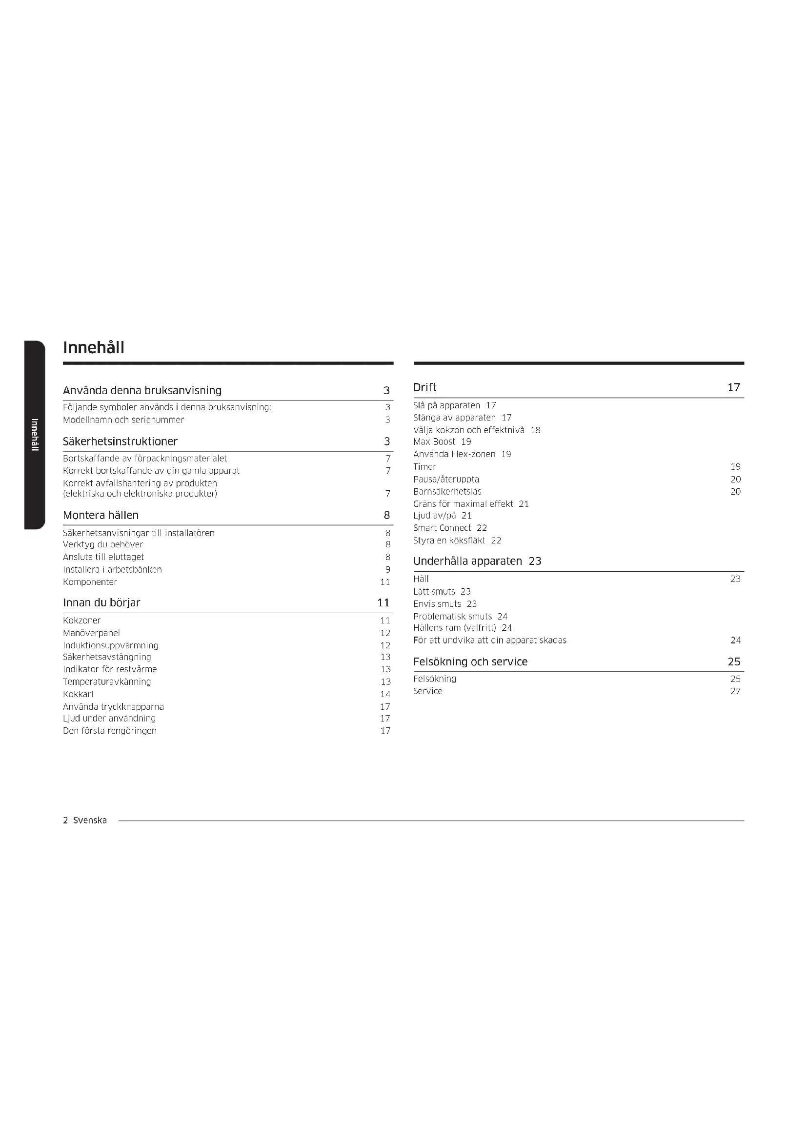 - (opłata według taryfy operatora) http://www.samsung.com/pl/ support/ ROMANIA 0800872678 - Apel gratuit *8000 - Apel tarifat în reţea Program Call Center Luni - Vineri: 9 AM - 6 PM www.samsung.com/ro/support SERBIA 011 321 6899 www.samsung.com/rs/support SLOVAKIA 0800 - SAMSUNG (0800-726 786) www.samsung.com/sk/support LITHUANIA 8-800-77777 www.samsung.com/lt/support LATVIA 8000-7267 www.samsung.com/lv/support ESTONIA 800-7267 www.samsung.com/ee/support SLOVENIA 080 697 267 (brezplačna številka) www.samsung.com/si/support KOSOVO 038 40 30 90 www.samsung.com/support SPØRGSMÅL ELLER KOMMENTARER?Induktionshäll Bruksanvisning NZ64B5067Y**2 Svenska Innehåll Innehåll Drift 17 Slå på apparaten 17 Stänga av apparaten 17 Välja kokzon och effektnivå 18 Max Boost 19 Använda Flex-zonen 19 Timer 19 Pausa/återuppta 20 Barnsäkerhetslås 20 Gräns för maximal effekt 21 Ljud av/på 21 Smart Connect 22 Styra en köksäkt 22 Underhålla apparaten 23 Häll 23 Lätt smuts 23 Envis smuts 23 Problematisk smuts 24 Hällens ram (valfritt) 24 För att undvika att din apparat skadas 24 Felsökning och service 25 Felsökning 25 Service 27 Innehåll Använda denna bruksanvisning 3 Följande symboler används i denna bruksanvisning: 3 Modellnamn och serienummer 3 Säkerhetsinstruktioner 3 Bortskaffande av förpackningsmaterialet 7 Korrekt bortskaffande av din gamla apparat 7 Korrekt avfallshantering av produkten (elektriska och elektroniska produkter) 7 Montera hällen 8 Säkerhetsanvisningar till installatören 8 Verktyg du behöver 8 Ansluta till eluttaget 8 Installera i arbetsbänken 9 Komponenter 11 Innan du börjar 11 Kokzoner 11 Manöverpanel 12 Induktionsuppvärmning 12 Säkerhetsavstängning 13 Indikator för restvärme 13 Temperaturavkänning 13 Kokkärl 14 Använda tryckknapparna 17 Ljud under användning 17 Den första rengöringen 17Svenska 3 Använda denna bruksanvisning Använda denna bruksanvisning Ta dig tid att läsa denna ägarhandbok och lägg särskild vikt vid säkerhetsinformationen i följande avsnitt innan du använder din apparat. Behåll denna bruksanvisning som referens. Kom ihåg att ge den nya ägaren denna bruksanvisning om apparaten får en ny ägare. Följande symboler används i denna bruksanvisning: VARNING Faror eller farlig hantering som kan resultera i allvarliga personskador eller dödsfall. VARNING Faror eller farlig hantering som kan resultera i mindre personskador eller skador på egendom. VARNING Följ dessa grundläggande säkerhetsåtgärder för att minska risken för brand, explosion, elektriska stötar eller personskador när hällen används. OBS! Användbara tips, rekommendationer eller information som hjälper användare att använda produkten. Modellnamn och serienummer Både modellnamnet och serienumret nns under hällens bas. Skriv ned informationen eller sätt fast den extra produktetiketten (sitter ovanpå produkten) på denna sida för framtida användning. Modellnamn Serienummer Säkerhetsinstruktioner Säkerhetsaspekterna för denna apparat överensstämmer med alla godkända tekniska standarder och säkerhetsstandarder. Som tillverkare anser vi dock också att det är vårt ansvar att informera dig om följande säkerhetsanvisningar. VARNING Denna apparat är inte avsedd för att användas av en person (inklusive barn) med nedsatt fysisk, sensorisk eller mental förmåga eller med brist på kunskap och erfarenhet. Detta gäller såvida de inte är under övervakning av, eller har fått instruktioner om hur apparaten används, från en person som ansvarar för deras säkerhet. Barn måste hållas under uppsikt för att säkerställa att de inte leker med apparaten. Denna apparat kan användas av barn som 8 år och äldre och av personer med nedsatt fysisk, sensorisk eller mental förmåga eller brist på erfarenhet och kunskap om de hålls under uppsikt eller har fått anvisningar om användningen av apparaten på ett säkert sätt och förstår farorna som är inblandade. Barn får inte leka med apparaten. Rengöring och underhåll får inte utföras av barn utan tillsyn. Möjligheten att koppla bort måste införlivas i de fasta ledningarna i enlighet med reglerna för ledningsdragning.4 Svenska Säkerhetsinstruktioner Säkerhetsinstruktioner VARNING: Tillagningen måste övervakas. En kortsiktig tillagning måste övervakas kontinuerligt. Apparaten får inte monteras bakom en dekorativ dörr eftersom detta kan leda till överhettning. VARNING: Apparaten och dess åtkomliga delar blir heta under användning. Var försiktig så att du inte vidrör värmeelement. Barn under 8 år bör hållas borta om de inte kan hållas under ständig uppsyn. VARNING: Oövervakad matlagning med fett eller olja på en häll kan vara farligt och leda till brand. Försök ALDRIG släcka en eld med vatten. Stäng i stället av apparaten och täck sedan lågan med t.ex. ett lock eller en brandlt. VARNING: Risk för brand: Förvara inte föremål på kokytorna. VARNING: Använd endast hällskydd som apparatens tillverkare har designat eller anger som lämpliga i bruksanvisningarna. Alternativt kan hällskydd som nns inbyggda i apparaten användas. Användning av olämpliga hällskydd kan orsaka olyckor. Ytorna kan bli varma vid användning. Denna apparat ska kunna kopplas bort från elnätet efter installationen. Bortkopplingen kan ske genom en åtkomlig kontakt eller en omkopplare placerad i de fasta ledningarna i enlighet med reglerna för ledningsdragning. Om strömsladden skadas måste den omedelbart ersättas av tillverkaren, dess servicerepresentant eller andra med motsvarande kompetens för att undvika fara. Den angivna xeringsmetoden innefattar inte limning eftersom detta inte anses vara en pålitligt xeringsmetod. VARNING: Om ytan är sprucken ska du stänga av apparaten för att minska risken för elektriska stötar. Under användning blir apparaten varm. Var försiktig så att du inte vidrör värmeelement inuti hällen. VARNING: Åtkomliga delar kan