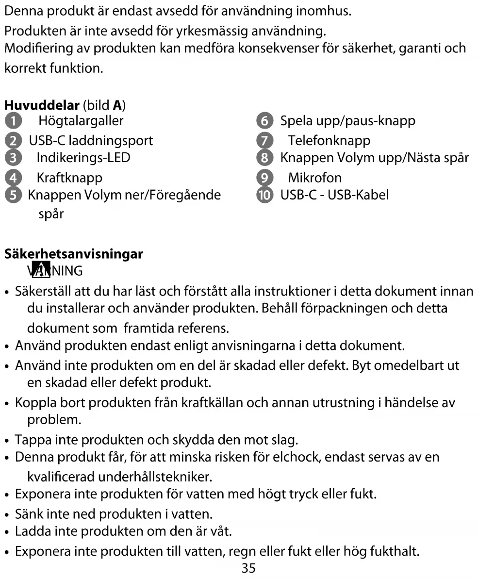 Snabbstartsguide Bluetooth®-högtalare SPBT1005BU För ytterligare information, se den utökade manualen online: ned.is/spbt1005bu Avsedd användning Den här produkten är avsedd att strömma ljud från din mediaenhet via Bluetooth®.35 Denna produkt är endast avsedd för användning inomhus. Produkten är inte avsedd för yrkesmässig användning. Modiering av produkten kan medföra konsekvenser för säkerhet, garanti och korrekt funktion. Huvuddelar (bild A) 1 Högtalargaller 2 USB-C laddningsport 3 Indikerings-LED 4 Kraftknapp 5 Knappen Volym ner/Föregående spår 6 Spela upp/paus-knapp 7 Telefonknapp 8 Knappen Volym upp/Nästa spår 9 Mikrofon q USB-C - USB-Kabel Säkerhetsanvisningar