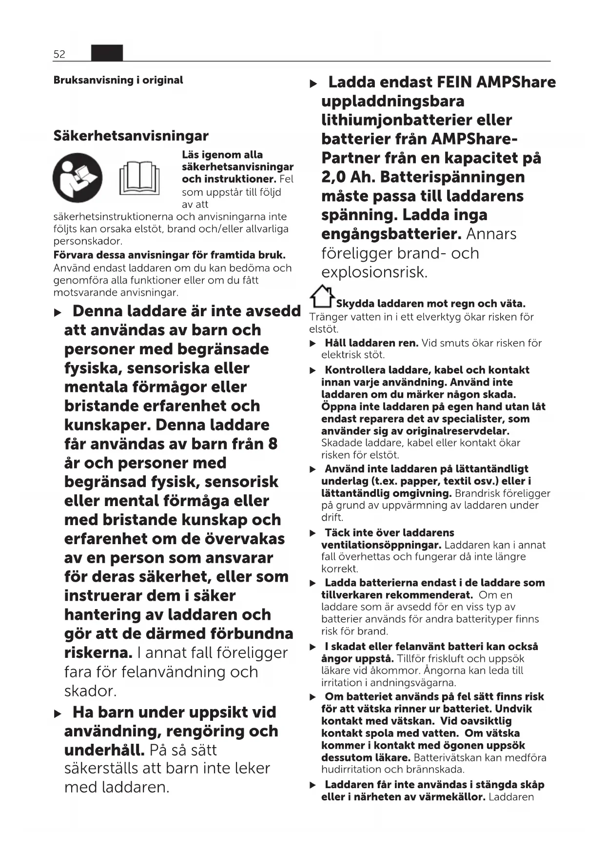 Sett batteriet riktig på laderen Skitne batterikontakter Rengjør batterikontaktene, f.eks. ved å sette inn og ta ut batteriet flere ganger, eller skift ut batteriet Batteri defekt Skift batteri Lader defekt Få eventuelt kontrollert laderen i et autorisert serviceverksted for FEIN elektroverktøy Grønn indikator for batteriladenivå (3) lyser ikke 50 no 34101366060 • 1.6.22Årsak Løsning Støpselet til laderen er ikke (riktig) satt inn Sett støpselet (helt inn) i stikkontakten Stikkontakt, strømkabel eller lader defekt Kontroller nettspenningen. Få eventuelt kontrollert laderen i et autorisert serviceverksted for FEIN elektroverktøy ArbeidshenvisningerNorsk En vesentlig kortere driftstid etter oppladingen er et tegn på at batteriet er oppbrukt og må skiftes ut. Ved kontinuerlige ladesykluser eller flere ladesykluser etter hverandre uten avbrudd kan laderen bli varm. Dette er imidlertid ikke farlig og betyr ikke at det er en teknisk feil på laderen. Batterikjøling (Active Air Cooling)Norsk Viftestyringen som er integrert i laderen overvåker temperaturen på batteriet som er satt inn. Batteriet avkjøles av en vifte så snart batteritemperaturen er over ca. 0 °C. Når viften er på, høres en ventilasjonslyd. Hvis ikke viften går, er den defekt, eller batteritemperaturen er under 0 °C. Det kan føre til at ladetiden blir lengre. LadingNorsk Modus Power BoostNorsk Med Power Boost lades batteriene til en kapasitet på ca. 50 % i hurtiglademodus. Dermed er disse batteriene raskere klare for bruk igjen sammenlignet med lading i standardlademodus. Med Power Boost lades batteriet først med høy ladestrøm, og deretter reduseres ladestrømmen trinnvis. Hvis batteriet blir værende i laderen, fortsetter ladingen. StandardlademodusNorsk Batteriet lades til kapasiteten er ca. 100 %. Standardlademodus er den beste kombinasjonen av kort ladetid og full opplading av batteriet. Standardlademodus optimerer batteriets levetid. Service og vedlikeholdNorsk Vedlikehold og rengjøringNorsk Hvis det er nødvendig å skifte ut tilkoblingsledningen, må dette gjøres av FEIN eller godkjente FEIN-serviceverksteder, slik at det ikke oppstår fare for sikkerheten. Rengjør ukentlig ved hyppig bruk. Følg disse anvisningene: – Pass på at kontaktene i tilkoblingsstykket alltid er rene. – De elektriske kontaktene må bare rengjøres tørt. – Pass på at det ikke kommer noen metallspon inn i huset til laderen. Vedlikehold og kundeserviceNorsk Overlat alle reparasjoner, alt vedlikehold og alle kontroller av laderen til godkjente elektrikere, ettersom ikke-forskriftsmessig reparasjon kan føre til stor fare for brukeren. Skift ut klistremerker og advarsler på laderen når disse blir slitt. Kontakt FEINs kundeservice ved behov for reparasjon på FEIN-ladere og -tilbehør. Du finner adressen på www.fein.com. GarantiNorsk Produktet er dekket av garanti ifølge lovbestemmelsene i landet der det ble solgt. I tillegg gir FEIN en garanti i samsvar med FEINs produsentgarantierklæring. Det kan hende at ditt produkt ble levert med bare en del av tilbehøret som er beskrevet eller avbildet i denne bruksanvisningen. DeponeringNorsk Lever ladere, tilbehør og emballasje til gjenvinning. Ladere må ikke kastes sammen med vanlig husholdningsavfall! Bare for land i EU:Norsk I henhold til det europeiske direktivet 2012/19/ EU om brukt elektrisk og elektronisk utstyr og tilpasningen til nasjonale lover må ladere som ikke lenger kan brukes, samles sortert og leveres til miljøvennlig gjenvinning. Ikke-forskriftsmessig håndtering av elektrisk og elektronisk avfall kan føre til miljø- og helseskader på grunn av eventuelle farlige stoffer. no 51 34101366060 • 1.6.22Bruksanvisning i original SäkerhetsanvisningarSvensk Läs igenom alla säkerhetsanvisningar och instruktioner. Fel som uppstår till följd av att säkerhetsinstruktionerna och anvisningarna inte följts kan orsaka elstöt, brand och/eller allvarliga personskador. Förvara dessa anvisningar för framtida bruk. Använd endast laddaren om du kan bedöma och genomföra alla funktioner eller om du fått motsvarande anvisningar. u Denna laddare är inte avsedd att användas av barn och personer med begränsade fysiska, sensoriska eller mentala förmågor eller bristande erfarenhet och kunskaper. Denna laddare får användas av barn från 8 år och personer med begränsad fysisk, sensorisk eller mental förmåga eller med bristande kunskap och erfarenhet om de övervakas av en person som ansvarar för deras säkerhet, eller som instruerar dem i säker hantering av laddaren och gör att de därmed förbundna riskerna. I annat fall föreligger fara för felanvändning och skador. u Ha barn under uppsikt vid användning, rengöring och underhåll. På så sätt säkerställs att barn inte leker med laddaren. u Ladda endast FEIN AMPShare uppladdningsbara lithiumjonbatterier eller batterier från AMPShare- Partner från en kapacitet på 2,0Ah. Batterispänningen måste passa till laddarens spänning. Ladda inga engångsbatterier. Annars föreligger brand- och explosionsrisk. Skydda laddaren mot regn och väta. Tränger vatten in i ett elverktyg ökar risken för elstöt. u Håll laddaren ren. Vid smuts ökar risken för elektrisk stöt. u Kontrollera laddare, kabel och kontakt innan varje användning. Använd inte laddaren om du märker någon skada. Öppna inte laddaren på egen hand utan låt endast reparera det av specialister, som använder sig av originalreservdelar. Skadade laddare, kabel eller kontakt ökar risken för elstöt. u Använd inte laddaren på lättantändligt underlag (t.ex. papper, textil osv.) eller i lättantändlig omgivning. Brandrisk föreligger på grund av uppvärmning av laddaren under drift. u Täck inte över laddarens ventilationsöppningar. Laddaren kan i annat fall överhettas och fungerar då inte längre korrekt. u Ladda batterierna endast i de laddare som tillverkaren rekommenderat. Om en laddare som är avsedd för en