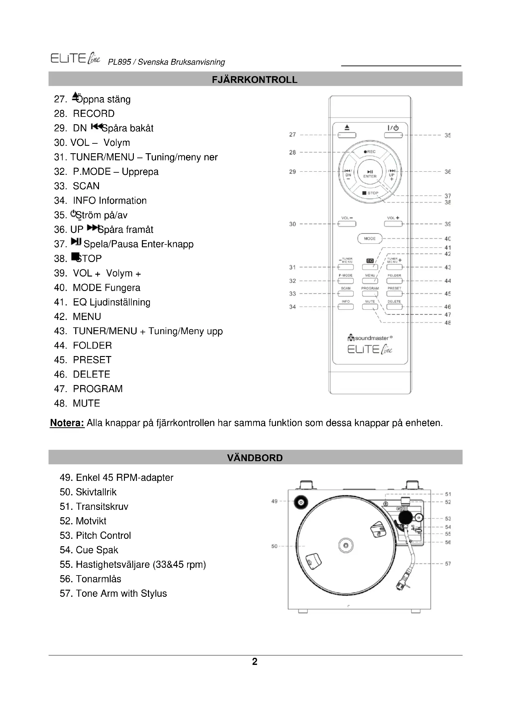 Notera: Alla knappar på fjärrkontrollen har samma funktion som dessa knappar på enheten. VÄNDBORD