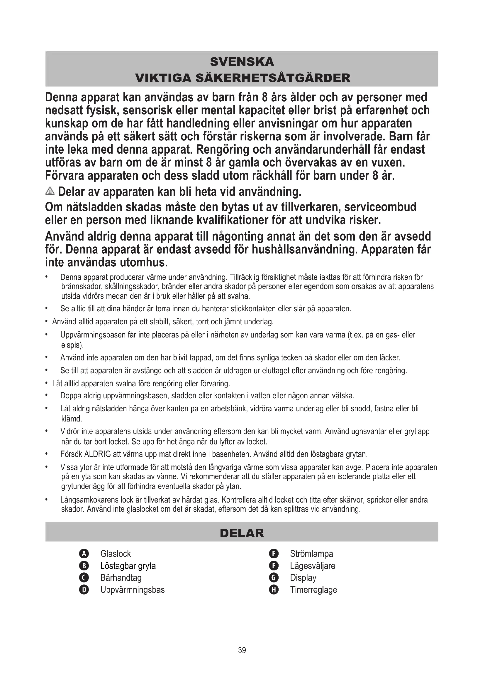Denna apparat kan användas av barn från 8 års ålder och av personer med nedsatt fysisk, sensorisk eller mental kapacitet eller brist på erfarenhet och kunskap om de har fått handledning eller anvisningar om hur apparaten används på ett säkert sätt och förstår riskerna som är involverade. Barn får inte leka med denna apparat. Rengöring och användarunderhåll får endast utföras av barn om de är minst 8 år gamla och övervakas av en vuxen. Förvara apparaten och dess sladd utom räckhåll för barn under 8 år. Delar av apparaten kan bli heta vid användning. Om nätsladden skadas måste den bytas ut av tillverkaren, serviceombud eller en person med liknande kvalifikationer för att undvika risker. Använd aldrig denna apparat till någonting annat än det som den är avsedd för. Denna apparat är endast avsedd för hushållsanvändning. Apparaten får inte användas utomhus.