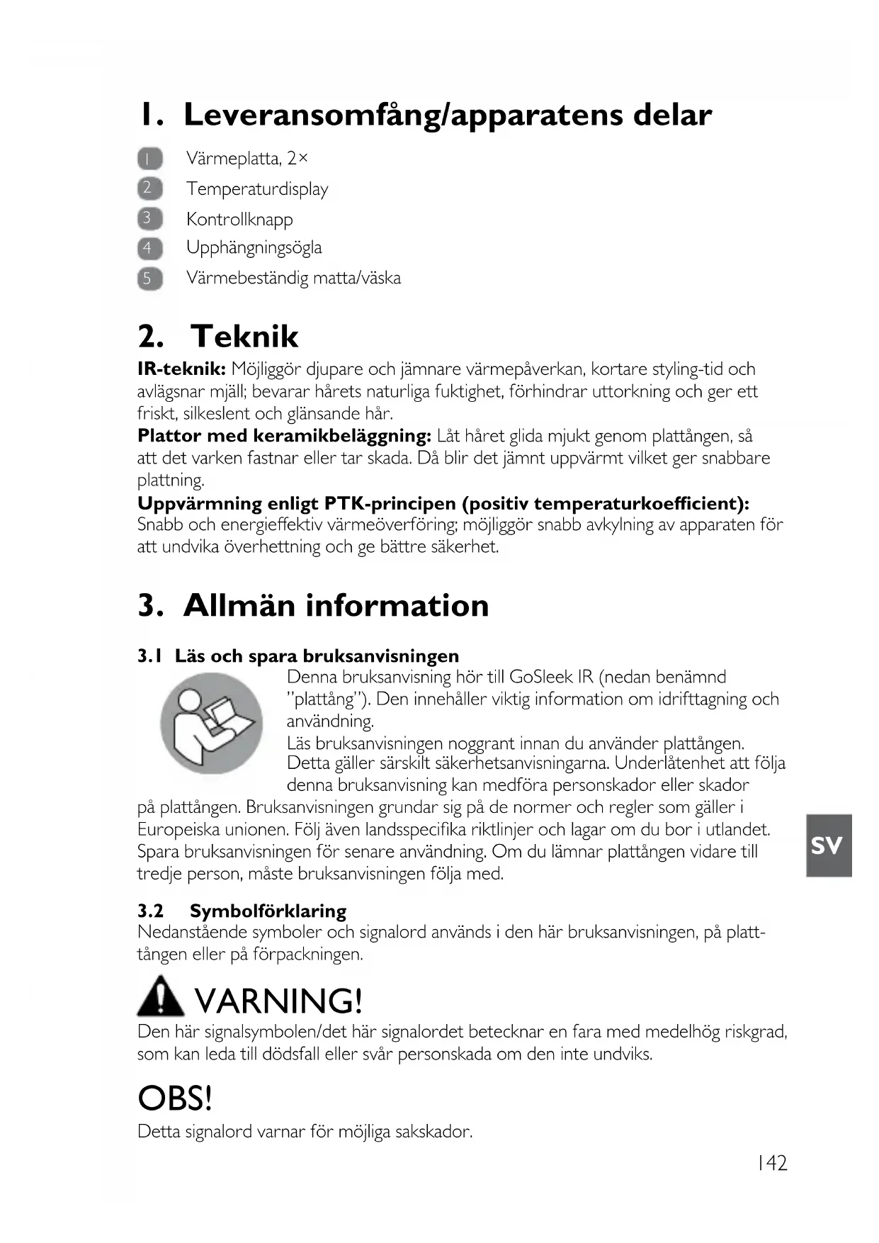 Nedanstående symboler och signalord används i den här bruksanvisningen, på platt- tången eller på förpackningen. VARNING! Den här signalsymbolen/det här signalordet betecknar en fara med medelhög riskgrad, som kan leda till dödsfall eller svår personskada om den inte undviks. OBS! Detta signalord varnar för möjliga sakskador.143