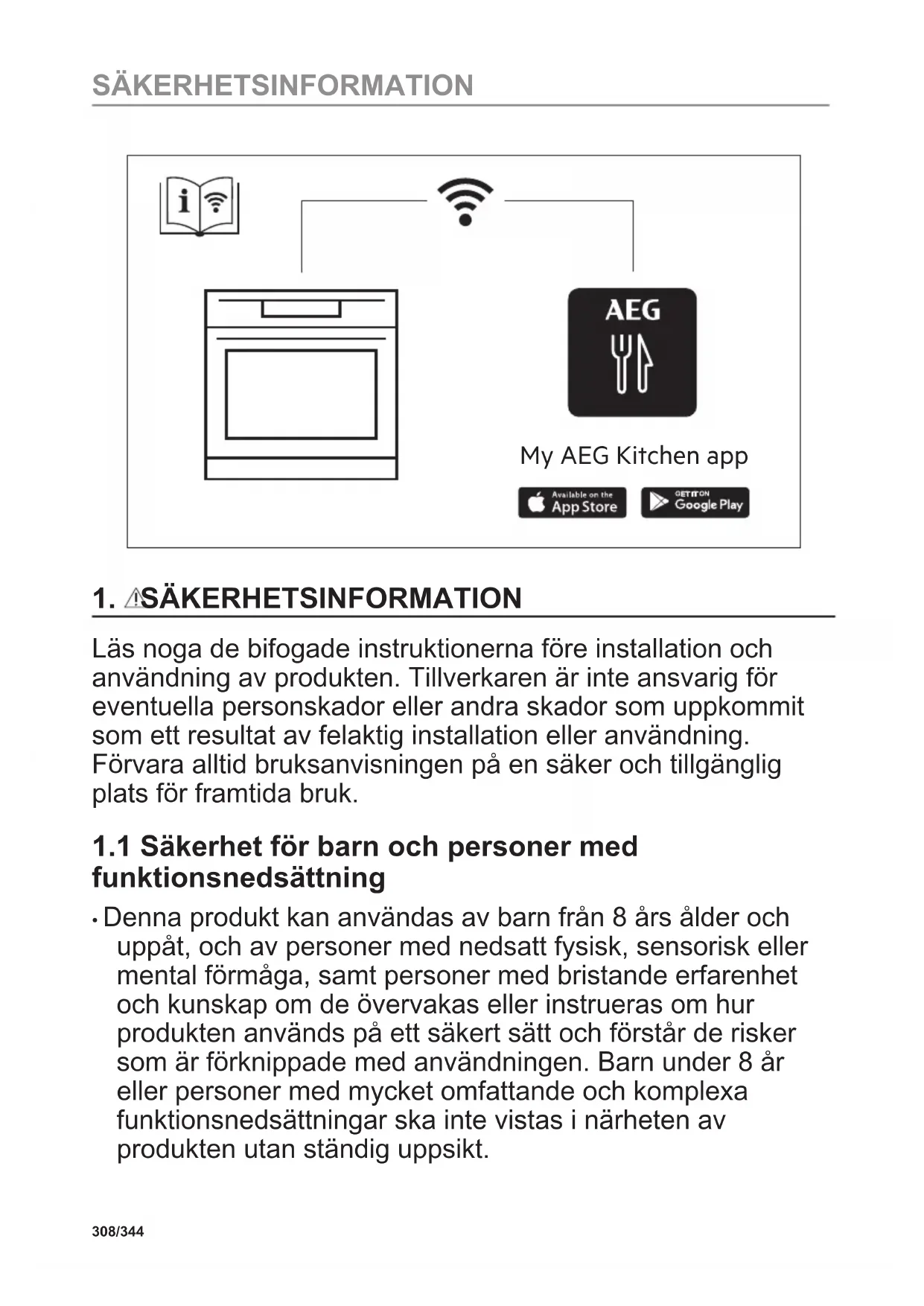 - Denna produkt kan användas av barn från 8 års ålder och uppåt, och av personer med nedsatt fysisk, sensorisk eller mental förmåga, samt personer med bristande erfarenhet och kunskap om de övervakas eller instrueras om hur produkten används på ett säkert sätt och förstår de risker som är förknippade med användningen. Barn under 8 år eller personer med mycket omfattande och komplexa funktionsnedsättningar ska inte vistas i närheten av produkten utan ständig uppsikt. 308/344 SÄKERHETSINFORMATION• Barn ska hållas under uppsikt så att de inte leker med produkten och mobilenheter med My AEG Kitchen .