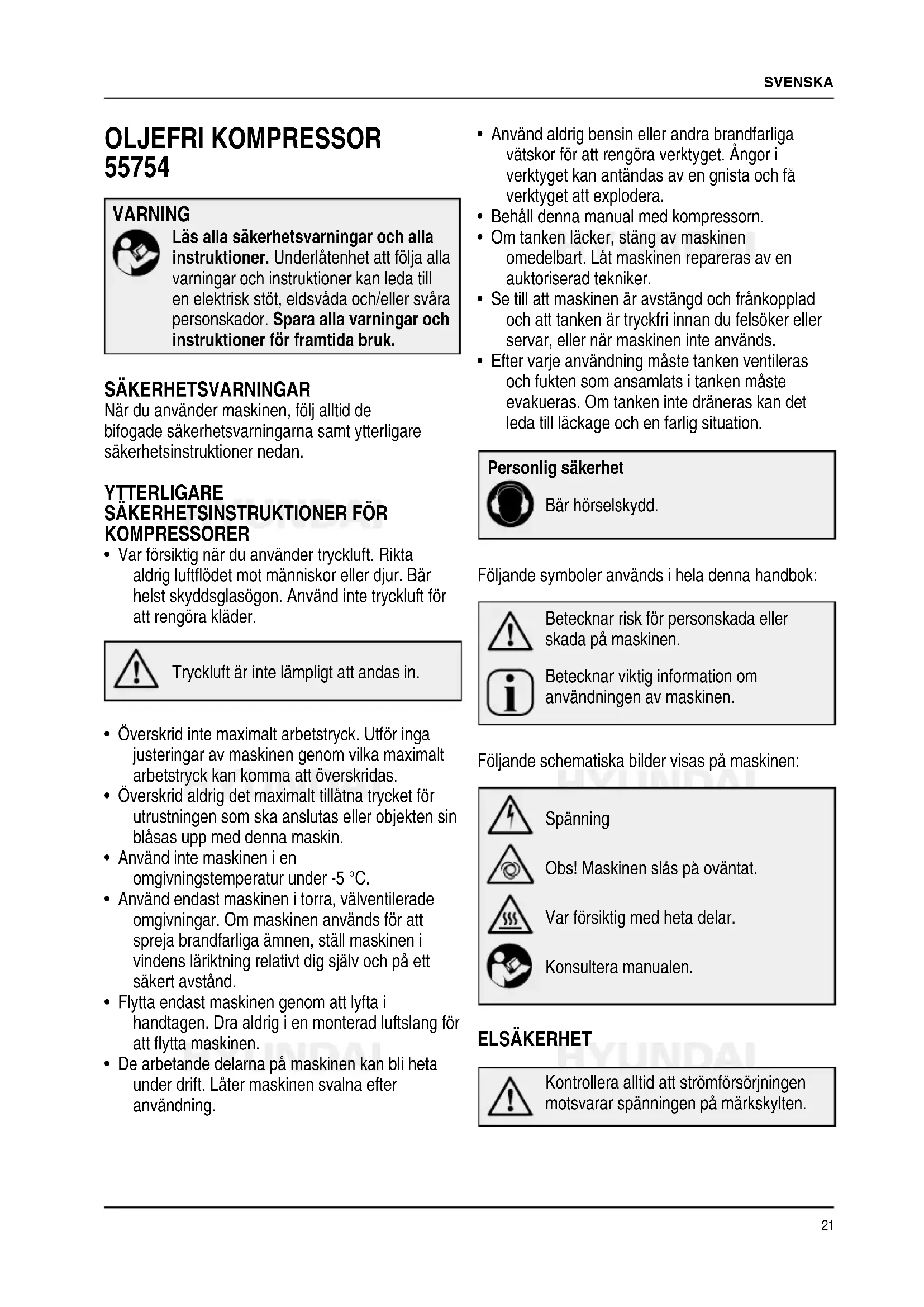 - Efter varje användning måste tanken ventileras och fukten som ansamlats i tanken måste evakueras. Om tanken inte dräneras kan det leda till läckage och en farlig situation. Personlig säkerhet Bär hörselskydd. Följande symboler används i hela denna handbok: Betecknar risk för personskada eller skada på maskinen. Betecknar viktig information om användningen av maskinen. Följande schematiska bilder visas på maskinen: Spänning Obs! Maskinen slås på oväntat. Var försiktig med heta delar. Konsultera manualen. ELSÄKERHET Kontrollera alltid att strömförsörjningen motsvarar spänningen på märkskylten.HYUNDAI