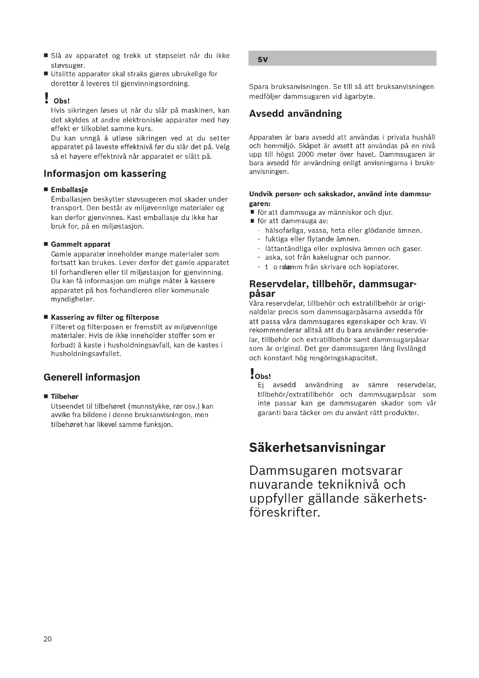 Spara bruksanvisningen. Se till så att bruksanvisningen medföljer dammsugaren vid ägarbyte. Avsedd användning Apparaten är bara avsedd att användas i privata hushåll och hemmiljö. Skåpet är avsett att användas på en nivå upp till högst 2000 meter över havet. Dammsugaren är bara avsedd för användning enligt anvisningarna i bruks- anvisningen. Undvik person- och sakskador, använd inte dammsu- garen: för att dammsuga av människor och djur. för att dammsuga av: -hälsofarliga, vassa, heta eller glödande ämnen. - fuktiga eller flytande ämnen. -lättantändliga eller explosiva ämnen och gaser. - aska, sot från kakelugnar och pannor. -tone rdamm från skrivare och kopiatorer. Reservdelar, tillbehör, dammsugar- påsar Våra reservdelar, tillbehör och extratillbehör är origi- naldelar precis som dammsugarpåsarna avsedda för att passa våra dammsugares egenskaper och krav. Vi rekommenderar alltså att du bara använder reservde- lar, tillbehör och extratillbehör samt dammsugarpåsar som är original. Det ger dammsugaren lång livslängd och konstant hög rengöringskapacitet. !Obs! Ej avsedd användning av sämre reservdelar, tillbehör/extratillbehör och dammsugarpåsar som inte passar kan ge dammsugaren skador som vår garanti bara täcker om du använt rätt produkter. Säkerhetsanvisningar Dammsugaren motsvarar nuvarande tekniknivå och uppfyller gällande säkerhets- föreskrifter.21 Barn under 8 år och personer med begränsad fysisk, senso- risk eller mental färdighet eller som saknar erfarenhet eller kunskaper får bara använda enheten under över- inseende av någon eller om de får lära sig hur man anv än- der enheten säkert och vilka risker som finns. Låt inte barn leka med enhe- ten. Barn får bara göra rengöring och skötsel under uppsikt. Plastpåsar och plastfolie ska hållas utom räckhåll för barn. => Kvävningsrisk föreligger! Avsedd användning Anslut och använd bara dammsugaren enligt märkskylten. Dammsug aldrig utan dammsugarpåse resp. - behållare, motorskydds- och utblåsfilter. => Dammsugaren kan skadas! Dammsug aldrig med munstycke eller rör i närheten av huvudet. => Olycksrisk! Dammsuger du trappor, så ska enheten a lltid stå nedanför användaren. Använd inte sladden för att bära/transportera dammsugaren. Är sladden till enheten skadad, så är det bara tillverkaren, service eller behörig elektriker som får byta ut den, allt för att undvika skador. Dra ut sladden helt om du ska dammsuga längre än 30 minuter. Dra i kontakten, inte i sladden, när du tar ur elanslutningen till dammsugaren. Dra inte sladden över vassa kanter och se till så att den inte blir fastklämd. Se till så att kontakte n inte slår emot personer, kroppsdelar, husdjur eller föremål vid automatiskt sladdindrag. => Styr sladden med kontakten. Slå alltid av och dra ur kontakten före arbeten på dammsugaren. Använd inte dammsugaren om den är t rasig. Dra ut kontakten ur uttaget om dammsugaren är trasig. Det är bara auktoriserad serviceverkstad som får göra reparationer och byta reservdelar på dammsugaren, allt för att undvika risker i användningen. Skydda dammsugaren från påverkan av väder, fukt och värme. Använd aldrig brännbara eller alkoholhaltiga ämnen på filtren (dammsugarpåse, motorskydds-, utblåsfilter etc). Dammsugaren är inte avsedd för användning på byggarbetsplatser. => Uppsugning av byggmaterial kan skada enheten. Slå av enheten och dra ur kontakten när du inte dammsuger. Gör uttjänta enheter obrukbara direkt, släng dem sedan i återvinningen. !Obs! Går säkringen när du startar dammsugaren, kan det bero på att du har andra elprodukter med hög effekt anslutna samtidigt till samma avsäkring (propp). Ställ in enheten på lägsta effektläget innan du slår på och öka sedan effekt, så går inte säkringen. Avfallshantering Förpackningen Förpackningen skyddar dammsugaren från skador vid transporten. Förpackningen är gjord av miljövänliga material och går att återvinna. Släng förpackningsmaterial du inte längre behöver i åter vinningen. Uttjänt enhet Uttjänta enheter innehåller ofta värdefulla material. Lämna därför in din uttjänta dammsugare till din återförsäljare resp. släng den i återvinningen. Information om återvinning får du hos din återförsäl jare eller kommun. Kassering av filter och dammpåse Filter och dammpåse är tillverkade i miljövänliga material. Om de inte innehåller några förbjudna ämnen kan de kastas i hushållssoporna. Allmänna anvisningar Tillbehör Utseendet på tillbehören (munstycke, dammsugarrör etc.) kan avvika från bilderna i bruksanvisningen, men funktionen är densamma.22