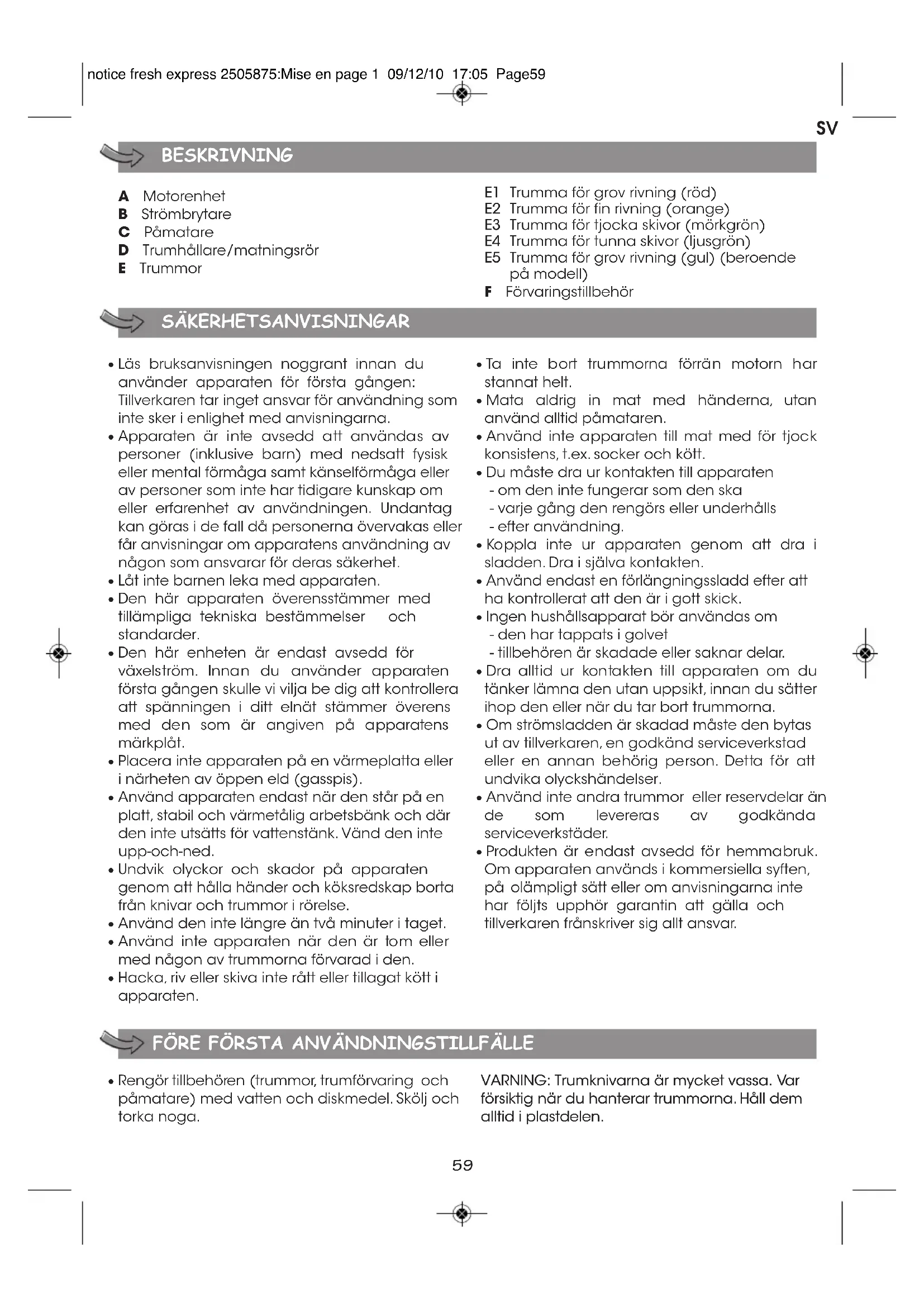 ELEKTRONISK PRODUKT VARS LIVSLÄNGD ÄR SLUT Apparaten är avsedd att användas i flera år. Den dagen du tänker byta ut den ska du inte slänga inte den i de vanliga hushållssoporna eller på soptippen, utan ta med den till en lämplig återvinningsstation. Var rädd om miljön! Apparaten innehåller mycket material som kan återanvändas eller återvinnas. Lämna den på en återvinningsstation så att den kan återvinnas. notice fresh express 2505875:Mise en page 1 09/12/10 17:05 Page6263 A Motorenhet B Av/på-knapp C Stapper D Kjegleholder/sjakt E Kjegler SIKKERHETSINSTRUKSJONER