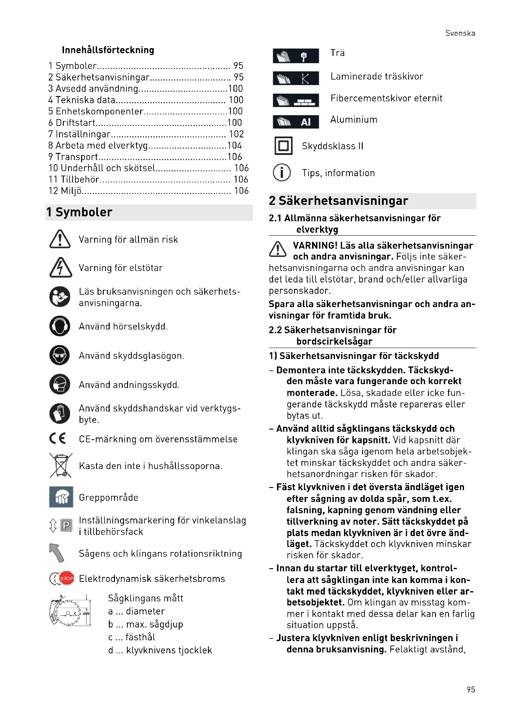 Sågklingans mått a ... diameter b ... max. sågdjup c ... fästhål d ... klyvknivens tjocklek Trä Laminerade träskivor Fibercementskivor eternit Aluminium Skyddsklass II Tips, information 2 Säkerhetsanvisningar