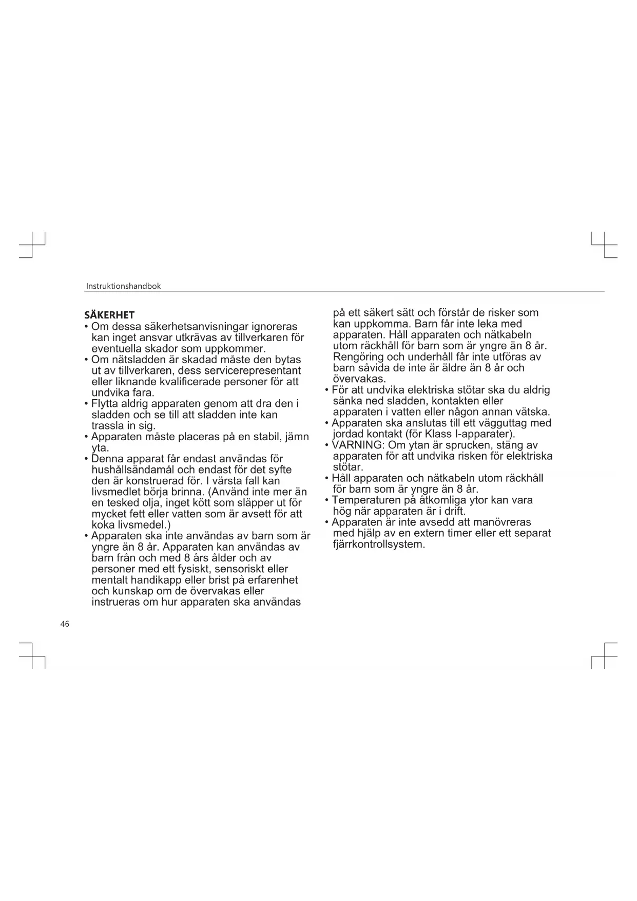 - Denna apparat får endast användas för hushållsändamål och endast för det syfte den är konstruerad för. I värsta fall kan livsmedlet börja brinna. (Använd inte mer än en tesked olja, inget kött som släpper ut för mycket fett eller vatten som är avsett för att koka livsmedel.)