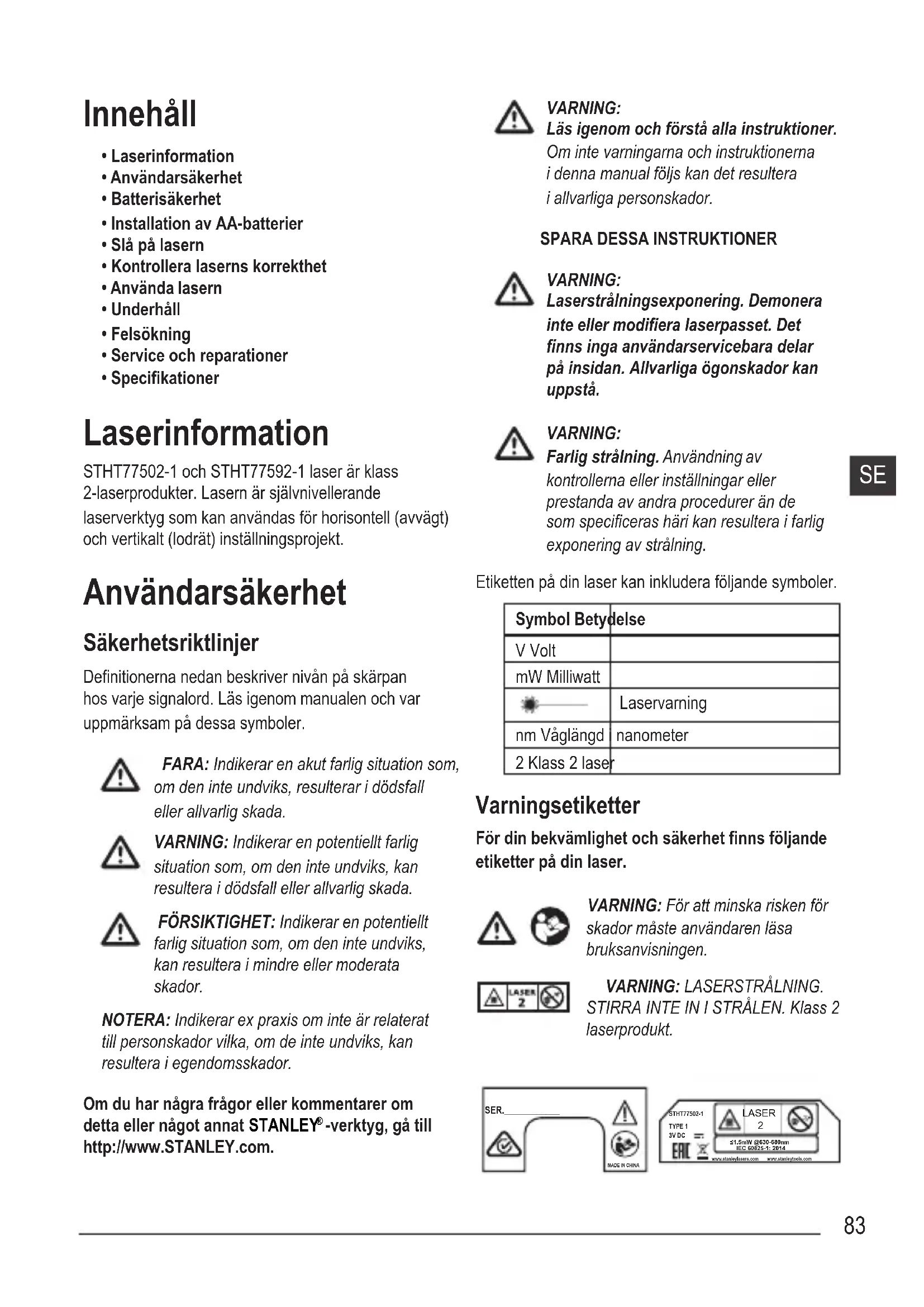 - Specikationer Laserinformation STHT77502-1 och STHT77592-1 laser är klass 2-laserprodukter. Lasern är självnivellerande laserverktyg som kan användas för horisontell (avvägt) och vertikalt (lodrät) inställningsprojekt. Användarsäkerhet Säkerhetsriktlinjer Denitionerna nedan beskriver nivån på skärpan hos varje signalord. Läs igenom manualen och var uppmärksam på dessa symboler. FARA: Indikerar en akut farlig situation som, om den inte undviks, resulterar i dödsfall eller allvarlig skada. VARNING: Indikerar en potentiellt farlig situation som, om den inte undviks, kan resultera i dödsfall eller allvarlig skada. FÖRSIKTIGHET: Indikerar en potentiellt farlig situation som, om den inte undviks, kan resultera i mindre eller moderata skador. NOTERA: Indikerar ex praxis om inte är relaterat till personskador vilka, om de inte undviks, kan resultera i egendomsskador. Om du har några frågor eller kommentarer om detta eller något annat STANLEY