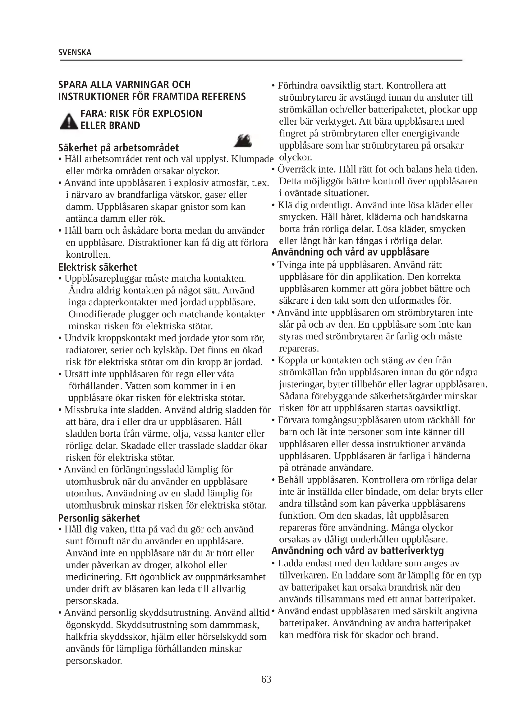 DRIFT. ADVARSEL: Håll dig vaken, titta på vad du gör och använd sunt förnuft när du använder en uppblåsare. Använd inte en uppblåsare när du är trött eller under påverkan av droger, alkohol eller medicinering. Ett ögonblick av ouppmärksamhet under drift av blåsaren kan leda till allvarlig personskada. Rikta aldrig något munstycke eller spruta mot någon del av kroppen eller mot andra människor eller djur.