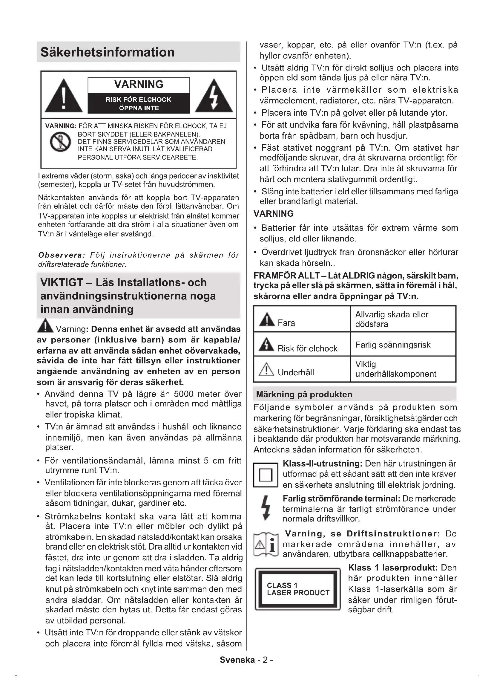 - Överdrivet ljudtryck från öronsnäckor eller hörlurar kan skada hörseln.. FRAMFÖR ALLT – Låt ALDRIG någon, särskilt barn, trycka på eller slå på skärmen, sätta in föremål i hål, skårorna eller andra öppningar på TV:n. FaraAllvarlig skada eller dödsfara Risk för elchockFarlig spänningsrisk UnderhållViktig underhållskomponent Märkning på produkten Följande symboler används på produkten som markering för begränsningar, försiktighetsåtgärder och