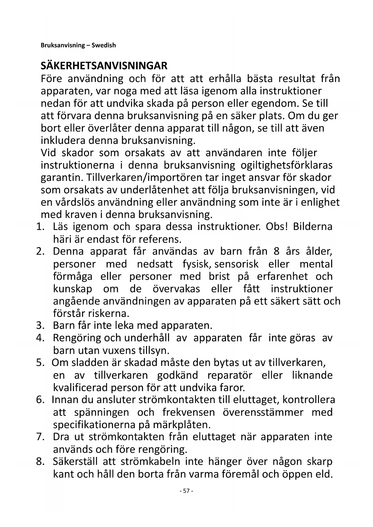 Innan leverans genomgår våra apparater en sträng kvalitetskontroll. Om det trots detta skulle uppstå någon skada på produktionen eller vid transporten, ber vi dig att ta med apparaten tillbaka till inköpsstället. För den köpta apparaten ges 2 års garanti, med början på inköpsdagen. Om du har en defekt produkt, kan du vända dig direkt till inköpsstället. Brister som uppstår genom felaktig hantering av apparaten och fel som uppstår genom ingrepp och reparationer av tredje man eller montering av främmande delar, omfattas ej av vår garanti. Behåll alltid ditt kvitto då det är din garanti vid eventuell reklamation. Skador som uppstår p.g.a. att instruktionsmanualen inte följs ogiltigförklarar garantin och om detta leder till påföljande skador så kan inte vi hållas ansvariga. Vi kan inte hållas ansvariga för materiella skador eller personskador som orsakas av felaktig användning eller om inte säkerhetsföreskrifterna följs. Skador på tillbehören innebär inte per automatik ersättning av hela apparaten. I sådana fall ska du kontakta vår kundservice. Trasigt glas och trasiga plastdelar innebär alltid en kostnad. Defekter på förbrukningsartiklar eller slitdelar och även skador orsakade av rengöring, underhåll eller byte av tidigare nämnda delar täcks inte av garantin och ska således betalas av ägaren.- 67 -