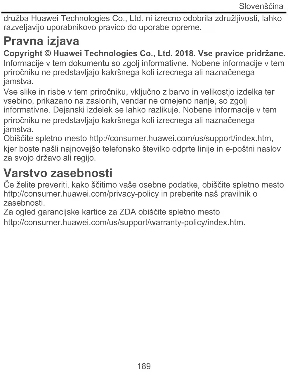 störningar och (2) enheten måste tåla alla former av störningar, inklusive störningar som kan orsaka oönskade effekter. Varning: Alla ändringar eller modifieringar av denna enhet som inte uttryckligen godkänts av Huawei Technologies Co., Ltd. kan upphäva användarens rätt att använda utrustningen. NA_NoTranslation Upphovsrätt © Huawei Technologies Co., Ltd. 2018. Alla rättigheter reserverade. Dokumentet är endast avsett som referens. Ingenting i denna handbok utgör en garanti av något slag, uttryckligt eller underförstått. Alla bilder och illustrationer i handboken, inklusive men inte begränsat till produktens färg, storlek och innehållet på skärmen, är endast avsedda som information. Den faktiska produkten kan se annorlunda ut. Ingenting i denna handbok utgör en garanti av något slag, uttryckligt eller underförstått. På http://consumer.huawei.com/us/support/index.htm finns den senaste informationen om vilka servicetelefonnummer och e-postadresser som gäller för ditt land eller din region. Sekretesskydd Om du vill förstå mer om hur vi skyddar dina personuppgifter kan du gå in på http://consumer.huawei.com/privacy-policy och läsa vår sekretesspolicy. För garantiinformation som gäller Förenta staterna, besök http://consumer.huawei.com/us/support/warranty-policy/index.htm.ﺔﯾﺑرﻌﻟا ﺔﻐﻠﻟا
