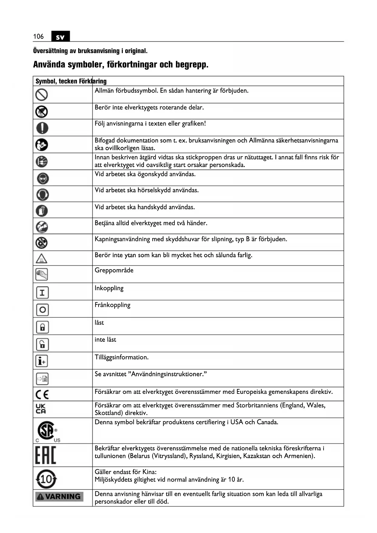 Översättning av bruksanvisning i original. Använda symboler, förkortningar och begrepp. Symbol, tecken Förklaring Allmän förbudssymbol. En sådan hantering är förbjuden. Berör inte elverktygets roterande delar. Följ anvisningarna i texten eller grafiken! Bifogad dokumentation som t. ex. bruksanvisningen och Allmänna säkerhetsanvisningarna ska ovillkorligen läsas. Innan beskriven åtgärd vidtas ska stickproppen dras ur nätuttaget. I annat fall finns risk för att elverktyget vid oavsiktlig start orsakar personskada. Vid arbetet ska ögonskydd användas. Vid arbetet ska hörselskydd användas. Vid arbetet ska handskydd användas. Betjäna alltid elverktyget med två händer. Kapningsanvändning med skyddshuvar för slipning, typ B är förbjuden. Berör inte ytan som kan bli mycket het och sålunda farlig. Greppområde Inkoppling Frånkoppling låst inte låst Tilläggsinformation. Se avsnittet ”Användningsinstruktioner.” Försäkrar om att elverktyget överensstämmer med Europeiska gemenskapens direktiv. Försäkrar om att elverktyget överensstämmer med Storbritanniens (England, Wales, Skottland) direktiv. Denna symbol bekräftar produktens certifiering i USA och Canada. Bekräftar elverktygets överensstämmelse med de nationella tekniska föreskrifterna i tullunionen (Belarus (Vitryssland), Ryssland, Kirgisien, Kazakstan och Armenien). Gäller endast för Kina: Miljöskyddets giltighet vid normal användning är 10 år. Denna anvisning hänvisar till en eventuellt farlig situation som kan leda till allvarliga personskador eller till död.107