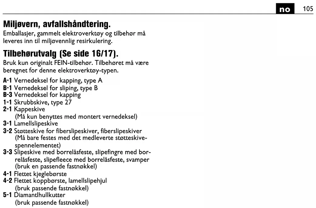 Tillbehörsurval (se sidan 16/17). Använd endast original FEIN-tillbehör. Tillbehöret mås- te vara godkänt för aktuell typ av elverktyg. A-1 Skyddshuv för kapning, typ A B-1 Skyddshuv för slipning, typ B B-3 Skyddskåpa för kapning 1-1 Skrubbskiva, typ 27 2-1 Kapskiva (får endast användas med monterad skyddskåpa) 3-1 Lamellslipskiva 3-2 Stödrondell för fiberslipskivor, fiberslipskivor (ditsättning endast med medföljande stödrondell- spänndon) 3-3 Sliprondell med kardborrfäste, häftslippapper, häft- slipfiber, svampar (Använd en lämplig fast skruvnyckel) 4-1 Konisk ståltrådsborste 4-2 Ståltrådskoppborste, lamellsliphjul (Använd en lämplig fast skruvnyckel) 5-1 Diamant hål cutter (Använd en lämplig fast skruvnyckel))114