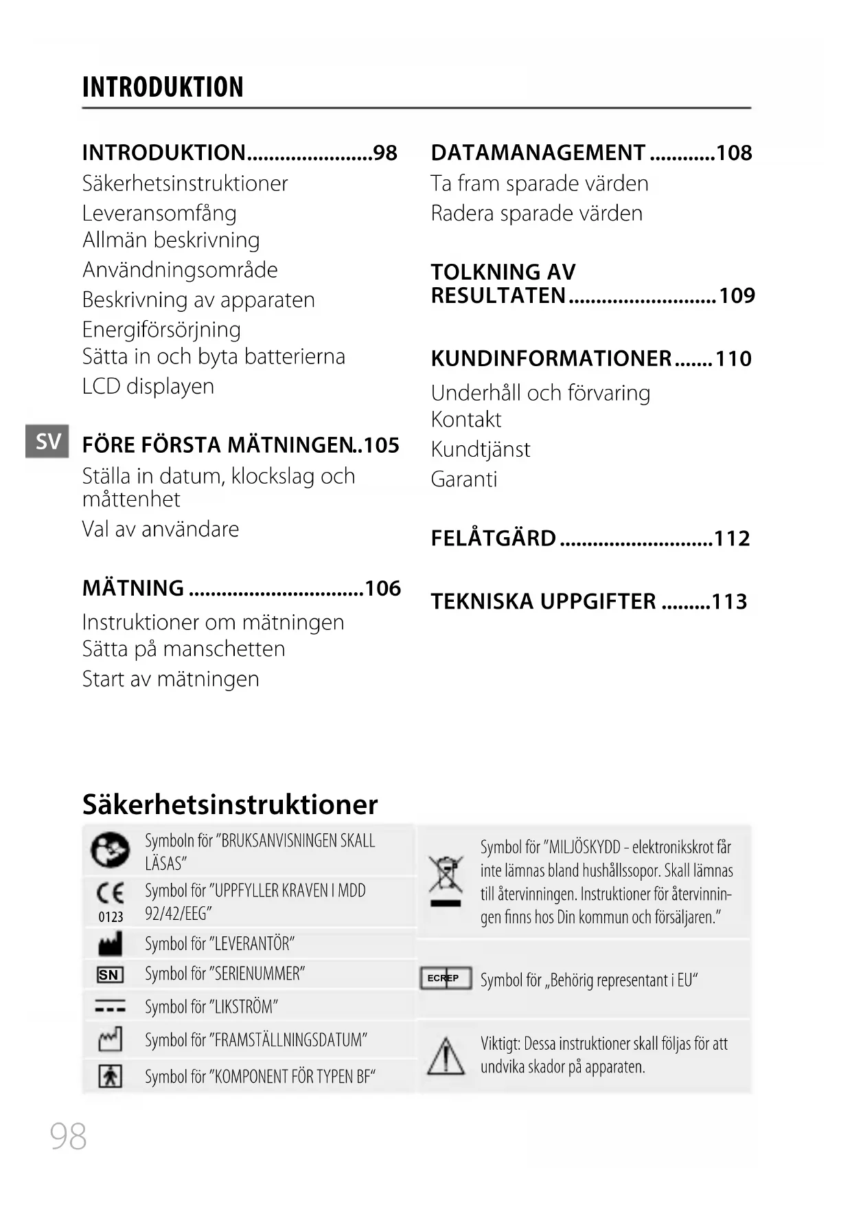 INTRODUKTION INTRODUKTION.......................98 Säkerhetsinstruktioner Leveransomfång Allmän beskrivning Användningsområde Beskrivning av apparaten Energiförsörjning Sätta in och byta batterierna LCD displayen