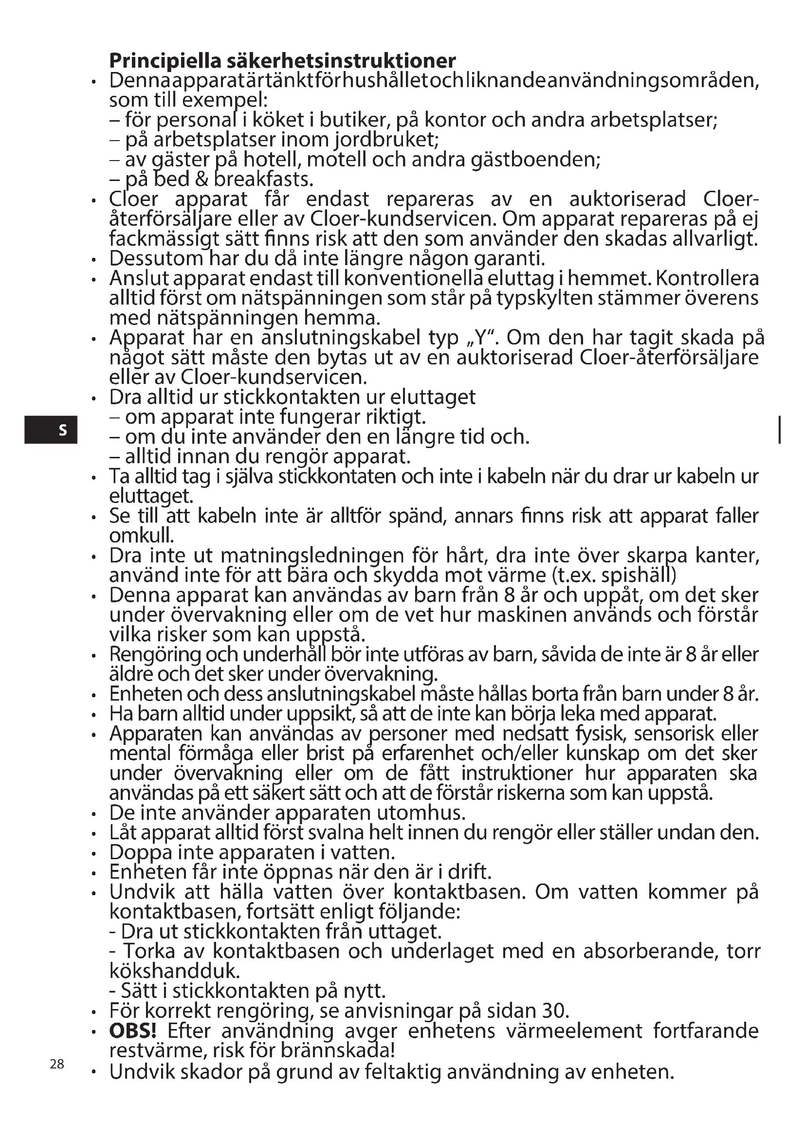 N28 Principiella säkerhetsinstruktioner Denna apparat är tänkt för hushållet och liknande användningsområden, som till exempel: – för personal i köket i butiker, på kontor och andra arbetsplatser; – på arbetsplatser inom jordbruket; – av gäster på hotell, motell och andra gästboenden; – på bed & breakfasts. Cloer apparat får endast repareras av en auktoriserad Cloer- återförsäljare eller av Cloer-kundservicen. Om apparat repareras på ej fackmässigt sätt nns risk att den som använder den skadas allvarligt. Dessutom har du då inte längre någon garanti. Anslut apparat endast till konventionella eluttag i hemmet. Kontrollera alltid först om nätspänningen som står på typskylten stämmer överens med nätspänningen hemma. Apparat har en anslutningskabel typ „Y“. Om den har tagit skada på något sätt måste den bytas ut av en auktoriserad Cloer-återförsäljare eller av Cloer-kundservicen. Dra alltid ur stickkontakten ur eluttaget – om apparat inte fungerar riktigt. – om du inte använder den en längre tid och. – alltid innan du rengör apparat. Ta alltid tag i själva stickkontaten och inte i kabeln när du drar ur kabeln ur eluttaget. Se till att kabeln inte är alltför spänd, annars nns risk att apparat faller omkull. Dra inte ut matningsledningen för hårt, dra inte över skarpa kanter, använd inte för att bära och skydda mot värme (t.ex. spishäll) Denna apparat kan användas av barn från 8 år och uppåt, om det sker under övervakning eller om de vet hur maskinen används och förstår vilka risker som kan uppstå. Rengöring och underhåll bör inte utföras av barn, såvida de inte är 8 år eller äldre och det sker under övervakning. Enheten och dess anslutningskabel måste hållas borta från barn under 8 år. Ha barn alltid under uppsikt, så att de inte kan börja leka med apparat. Apparaten kan användas av personer med nedsatt fysisk, sensorisk eller mental förmåga eller brist på erfarenhet och/eller kunskap om det sker under övervakning eller om de fått instruktioner hur apparaten ska användas på ett säkert sätt och att de förstår riskerna som kan uppstå. De inte använder apparaten utomhus. Låt apparat alltid först svalna helt innen du rengör eller ställer undan den. Doppa inte apparaten i vatten. Enheten får inte öppnas när den är i drift. Undvik att hälla vatten över kontaktbasen. Om vatten kommer på kontaktbasen, fortsätt enligt följande: - Dra ut stickkontakten från uttaget. - Torka av kontaktbasen och underlaget med en absorberande, torr kökshandduk. - Sätt i stickkontakten på nytt. För korrekt rengöring, se anvisningar på sidan 30. OBS! Efter användning avger enhetens värmeelement fortfarande restvärme, risk för brännskada! Undvik skador på grund av feltaktig användning av enheten.
