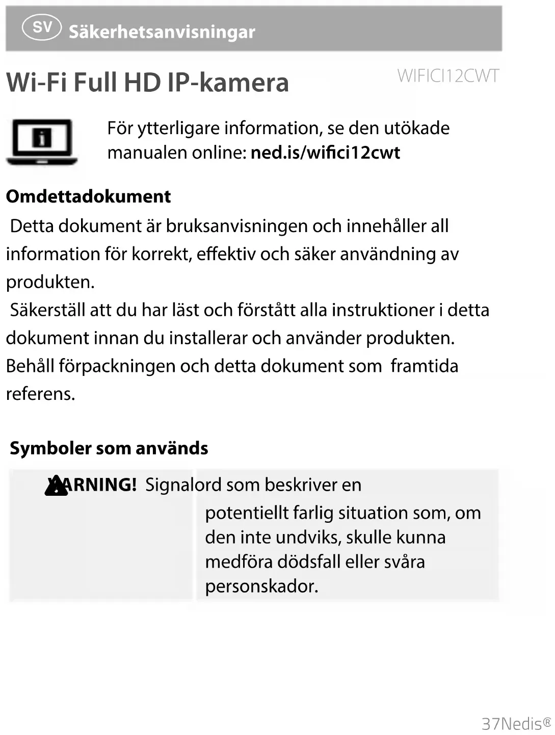 Säkerhetsanvisningar Wi-Fi Full HD IP-kamera WIFICI12CWT För ytterligare information, se den utökade manualen online: ned.is/wici12cwt Om detta dokument Detta dokument är bruksanvisningen och innehåller all information för korrekt, eektiv och säker användning av produkten. Säkerställ att du har läst och förstått alla instruktioner i detta dokument innan du installerar och använder produkten. Behåll förpackningen och detta dokument som framtida referens. Symboler som används