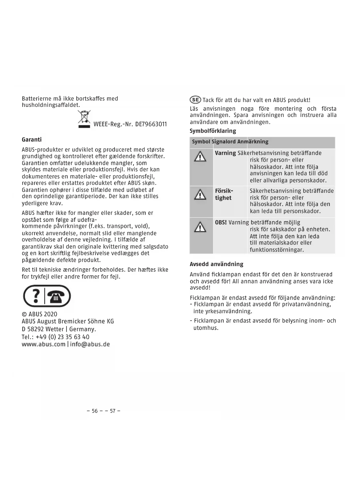 öppna stäng– 62 – – 63 – Garanti ABUS-produkter är noggrant utformade, tillverkade och testade enligt gällande föreskrier. Garantin omfattar bara sådana brister som beror på material- eller tillverkningsfel. Finns det bevisligen material- eller tillverkningsfel, så reparerar eller ersätter ABUS produkten eer egen bedömning. Garantin upphör i så fall i och med att den ursprungliga garantitiden går ut. Ytterligare anspråk är uttryckligen uteslutna. ABUS ansvarar inte för brister eller skador som beror på yttre påverkan (t.ex. transport, våldsanvändning), felanvändning, normal förslitning eller att man inte följt anvisningarna i bruksanvisningen. Bifoga originalkvittot med inköpsdatum och en kort, skrilig felbeskrivning av felet på den reklamerade produkten vid garantiärenden. Tekniska ändringar är förbehållna. För tryckfel och misstag tas inget ansvar. © ABUS 2020 ABUS August Bremicker Söhne KG D 58292 Wetter | Germany. Tel.: +49 (0) 23 35 63 40