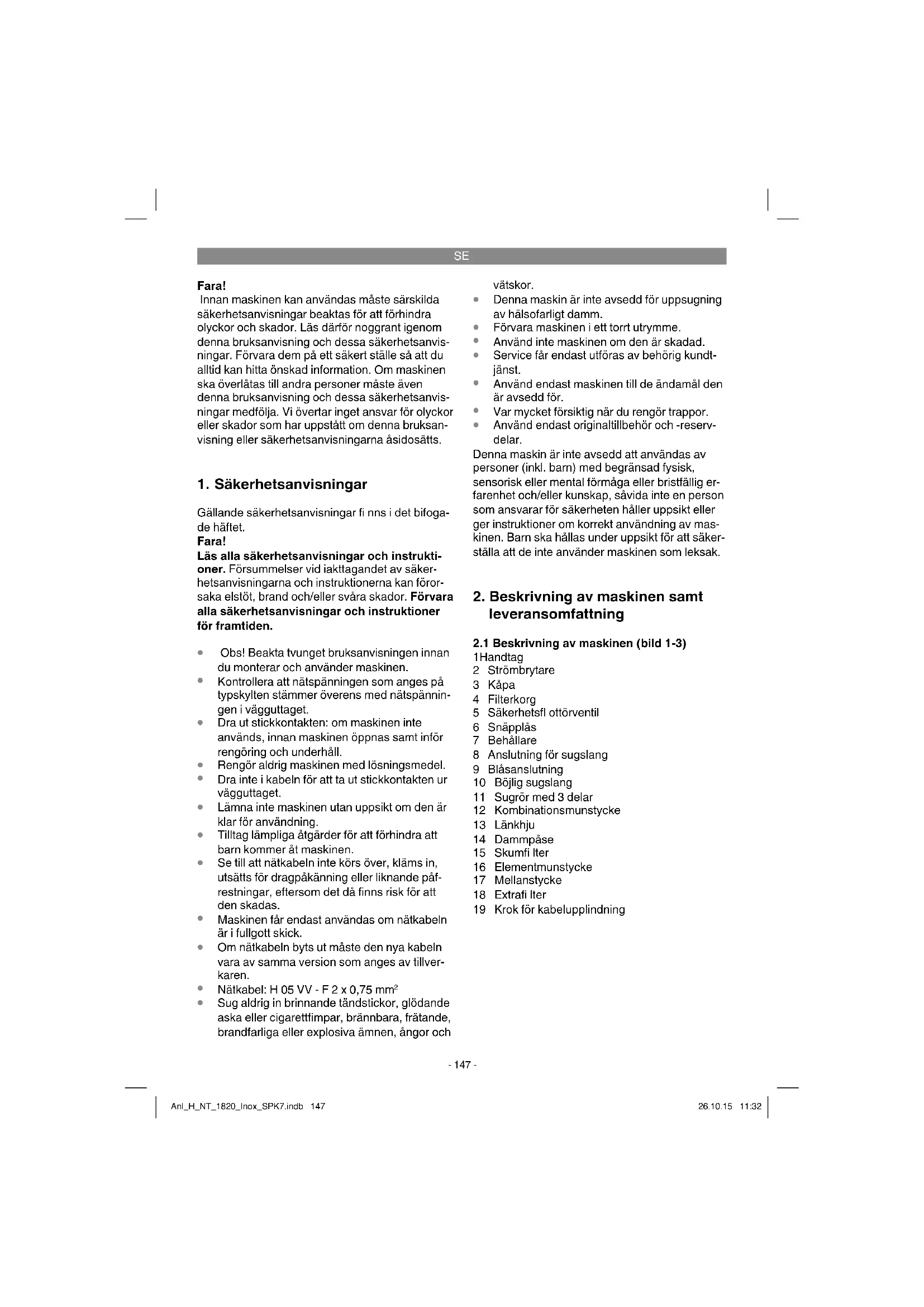 1 Handtag 2 Strömbrytare 3 Kåpa 4 Filterkorg 5 Säkerhetsfl ottörventil 6 Snäpplås 7 Behållare 8 Anslutning för sugslang 9 Blåsanslutning 10 Böjlig sugslang 11 Sugrör med 3 delar 12 Kombinationsmunstycke 13 Länkhju 14 Dammpåse 15 Skumfi lter 16 Elementmunstycke 17 Mellanstycke 18 Extrafi lter 19 Krok för kabelupplindning Anl_H_NT_1820_Inox_SPK7.indb 147Anl_H_NT_1820_Inox_SPK7.indb 147 26.10.15 11:3226.10.15 11:32SE