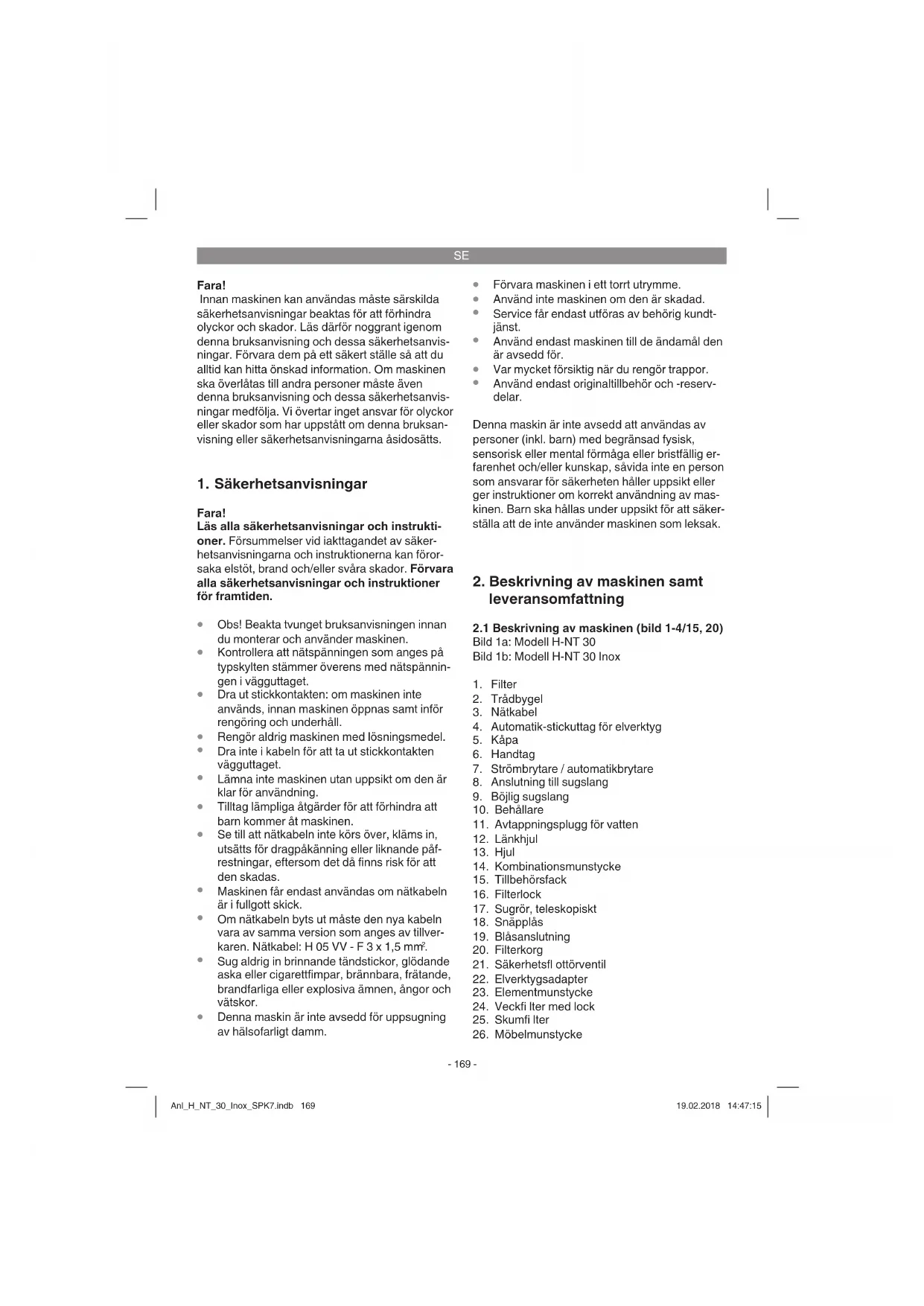 Kombinationsmunstycke (bild 3) Kombinationsmunstycket (14) är avsett för upp- sugning av fasta ämnen och vätskor på medelsto- ra till stora ytor. Elementmunstycke (bild 3) Elementmunstycket (23) används till att suga upp fasta partiklar och vätska från hörn, kanter och andra svåråtkomliga ställen. Möbelmunstycke (bild 3) Möbelmunstycket (26) är speciellt avsett för att suga bort fasta partiklar på möbler och mattor. Anl_H_NT_30_Inox_SPK7.indb 171Anl_H_NT_30_Inox_SPK7.indb 171 19.02.2018 14:47:1519.02.2018 14:47:15SE
