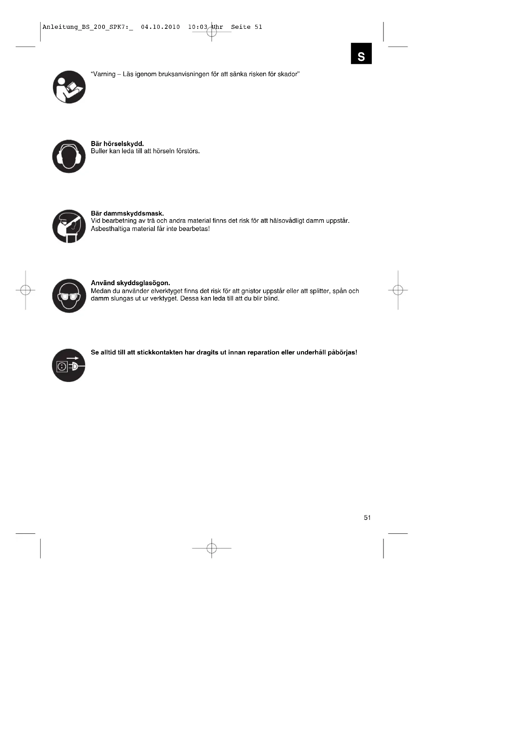 “Varning – Läs igenom bruksanvisningen för att sänka risken för skador” Bär hörselskydd. Buller kan leda till att hörseln förstörs. Bär dammskyddsmask. Vid bearbetning av trä och andra material finns det risk för att hälsovådligt damm uppstår. Asbesthaltiga material får inte bearbetas! Använd skyddsglasögon. Medan du använder elverktyget finns det risk för att gnistor uppstår eller att splitter, spån och damm slungas ut ur verktyget. Dessa kan leda till att du blir blind. Se alltid till att stickkontakten har dragits ut innan reparation eller underhåll påbörjas! Anleitung_BS_200_SPK7:_ 04.10.2010 10:03 Uhr Seite 51 Obs! Innan maskinen kan användas måste särskilda säkerhetsanvisningar beaktas för att förhindra olyckor och skador. Läs därför noggrant igenom denna bruksanvisning och dessa säkerhetsanvisningar. Förvara dem på ett säkert ställe så att du alltid kan hitta önskad information. Om maskinen ska överlåtas till andra personer måste även denna bruksanvisning och dessa säkerhetsanvisningar medfölja. Vi övertar inget ansvar för olyckor eller skador som har uppstått om denna bruksanvisning eller säkerhetsanvisningarna åsidosätts.