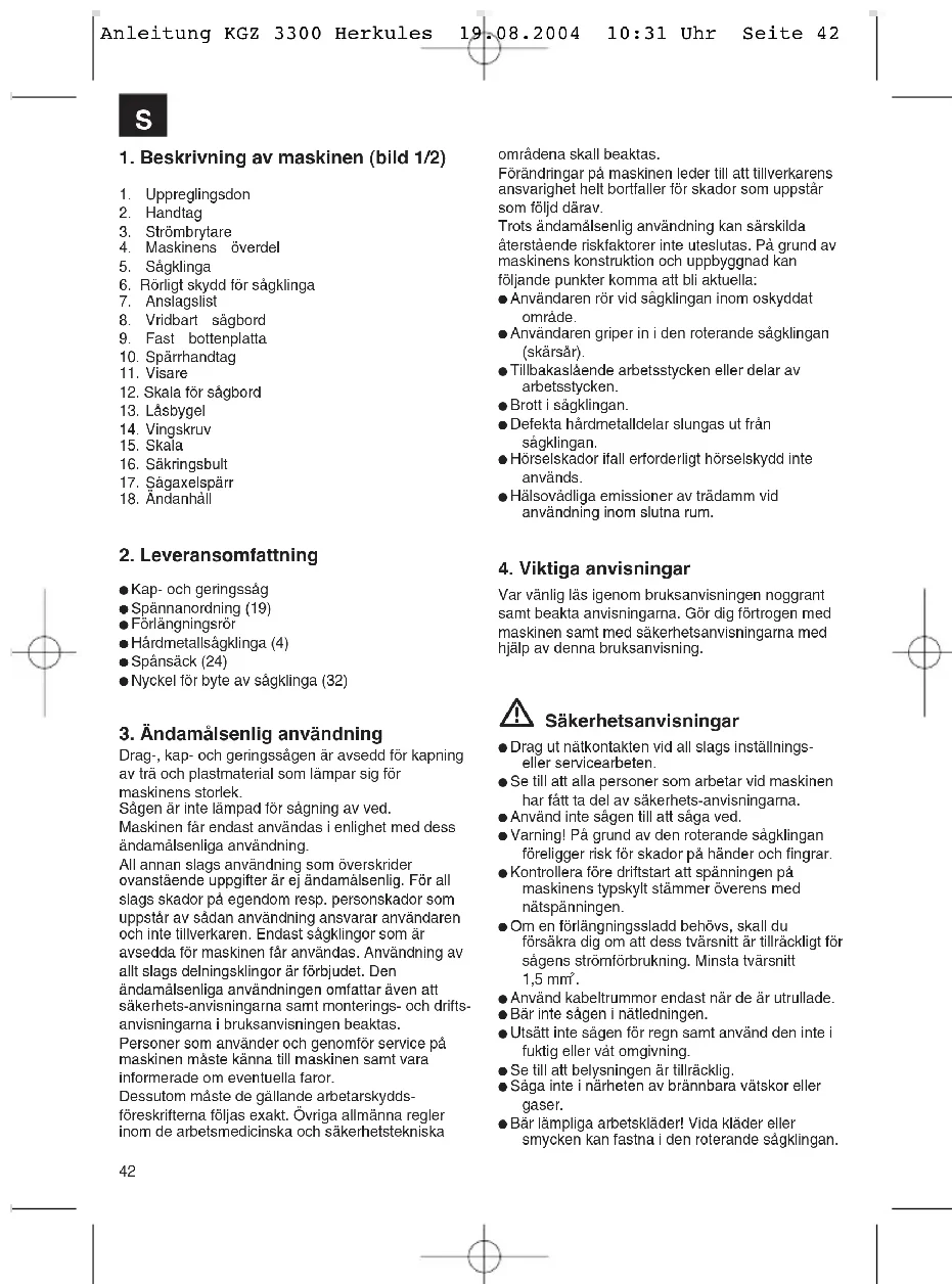Använd kabeltrummor endast när de är utrullade. Bär inte sågen i nätledningen. Utsätt inte sågen för regn samt använd den inte i fuktig eller våt omgivning. Se till att belysningen är tillräcklig. Såga inte i närheten av brännbara vätskor eller gaser. Bär lämpliga arbetskläder! Vida kläder eller smycken kan fastna i den roterande sågklingan. Anleitung KGZ 3300 Herkules 19.08.2004 10:31 Uhr Seite 42S