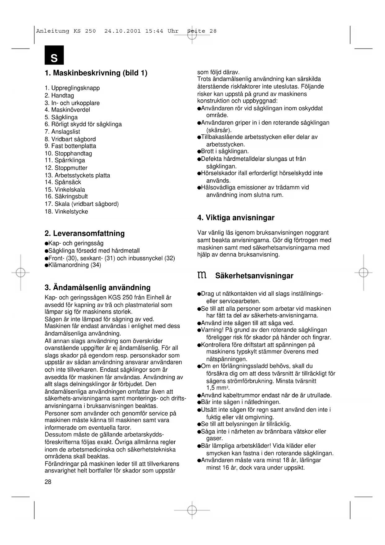 Anleitung KS 250 24.10.2001 15:44 Uhr Seite 2829 Se till att barn inte befinner sig vid maskinen om den är ansluten till nätet. Kontrollera nätanslutningsledningen. Använd inga defekta eller skadade anslutnings-ledningar. Se till att arbetsplatsen är fri från träavfall och omkringliggande delar. Personer som arbetar vid maskinen får inte distraheras. Beakta motorns och sågklingans rotations- riktning. Efter att driften har kopplats ur, får sågklingan under inga omständigheter bromsas genom att man pressar in dess sidor. Montera endast in vassa, sprickfria och ej deformerade sågklingor. Endast verktyg som motsvarar prEN 847:1:1996 får användas vid maskinen. Defekta sågklingor måste omedelbart bytas ut. Använd inga sågklingor som inte motsvarar specifikationerna som anges i denna bruksanvisning. Försäkra dig om att pilen på sågklingan stämmer överens med pilen på maskinen. Försäkra dig om att sågklingan oavsett läge inte berör det vridbara sågbordet genom att vrida sågklingan per hand i lägena 45° och 90°, förutsatt att nätkontakten har dragits ur. Vid behov måste sågens överdel justeras om enl. punkt C/F. Försäkra dig om att alla anordningar som täcker sågklingan fungerar i fullgott tillstånd. Den rörliga skyddskåpan får inte klämmas fast vid öppnat tillstånd. Säkerhetsanordningar vid maskinen får inte demonteras eller göras funktionsodugliga. Skadade eller defekta skyddsanordningar skall omedelbart bytas ut. Såga inga arbetsstycken som har så liten storlek att de inte kan hållas med handen på ett säkert sätt. Undvik att ha handen eller händerna placerade på ett sådant olämplig sätt att de kan skadas av sågklingan om de plötsligt skulle glida. Vid längre arbetsstycken är ett extra support (bord, bockar etc.) erforderligt för att undvika att maskinen tippar. Runda arbetsstycken som t.ex. pluggstänger etc., måste alltid vara fastspända med någon lämplig anordning. Spik eller andra främmande föremål får inte befinna sig i den del av arbetsstycket som ska sågas. Arbeta alltid vid sidan om sågklingan. Belasta inte maskinen på ett sådant sätt att den stannar. Tryck alltid arbetsstycket mot arbetsplattan och anslagslisten för att förhindra att arbetsstycket vacklar eller vrids. Försäkra dig om att de avsågade delarna kan falla bort från sågklingan. I annat fall kan de fastna i sågklingan och slungas iväg. Såga aldrig flera arbetsstycken samtidigt. Tag aldrig bort löst splitter, spån eller fastklämda träbitar medan sågklingan roterar. Innan störningar elimineras eller fastklämda träbitar tas bort, skall maskinen kopplas ur. -Drag ut nätkontakten - Ombestyckning samt inställnings-, mät- samt rengöringsarbeten får endast genomföras vid urkopplad motor. - Drag ut nätkontakten - Kontrollera före inkoppling att nycklar och inställningsverktyg har tagits bort. Koppla ur motorn samt drag ut nätkontakten när du lämnar arbetsplatsen. Elinstallations- och servicearbeten samt reparationer får endast genomföras av fackmän. Efter avslutad reparation resp. service måste samtliga skydds- och säkerhetsanordningar monteras fast på nytt. Tillverkarens säkerhets-, arbets- samt serviceanvisningar samt måtten som anges i förteckningen över tekniska data skall beaktas. De hithörande arbetarskyddsföreskrifterna samt övriga, allmänt erkända säkerhets-tekniska regler måste beaktas. Beakta anvisningshäftena från yrkesförbundet (VBG 7j) Anslut dammutsugningsanordningen vid alla slags arbeten. Drift i slutna rum är endast tillåtet vid lämplig utsugningsanläggning. Kapsågen måste anslutas till ett 230 V jordat uttag med minst 10 A säkring. Använd inga effektsvaga maskiner för krävande arbeten. Använd kabeln endast till sådana ändamål som den är avsedd för. Se alltid till att du står stadigt och inte kan tappa balansen. Kontrollera att verktyget inte är skadat. Kontrollera innan verktyget används att skyddsanordningarna eller delar som endast har skadats i mindre mån fungerar på ett fullgott och ändamålsenligt sätt. Kontrollera att de rörliga delarna fungerar på ett fullgott sätt och inte kläms fast. Försäkra dig dessutom om att inga delar är skadade. För att säkerställa att verktyget fungerar på ett fullgott sätt, måste samtliga delar vara korrekt monterade och uppfylla alla krav.