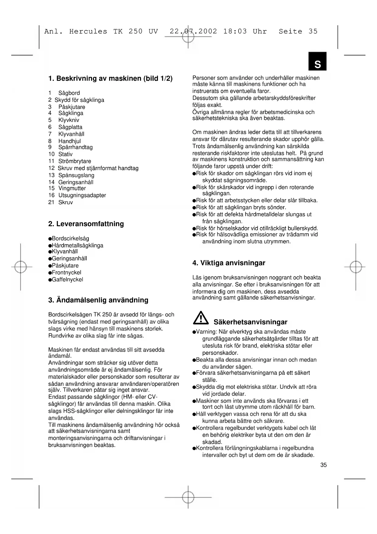 Läs igenom bruksanvisningen noggrant och beakta alla anvisningar. Se efter i bruksanvisningen för att informera dig om maskinen, dess avsedda användning samt gällande säkerhetsanvisningar. Säkerhetsanvisningar Varning: När elverktyg ska användas måste grundläggande säkerhetsåtgärder tilltas för att utesluta risk för brand, elektriska stötar eller personskador. Beakta alla dessa anvisningar innan och medan du använder sågen. Förvara säkerhetsanvisningarna på ett säkert ställe. Skydda dig mot elektriska stötar. Undvik att röra vid jordade delar. Maskiner som inte används ska förvaras i ett torrt och låst utrymme utom räckhåll för barn. Håll verktygen vassa och rena för att du ska kunna arbeta bättre och säkrare. Kontrollera regelbundet verktygets kabel och låt en behörig elektriker byta ut den om den är skadad. Kontrollera förlängningskablarna i regelbundna intervaller och byt ut dem om de är skadade. Anl. Hercules TK 250 UV 22.07.2002 18:03 Uhr Seite 35S