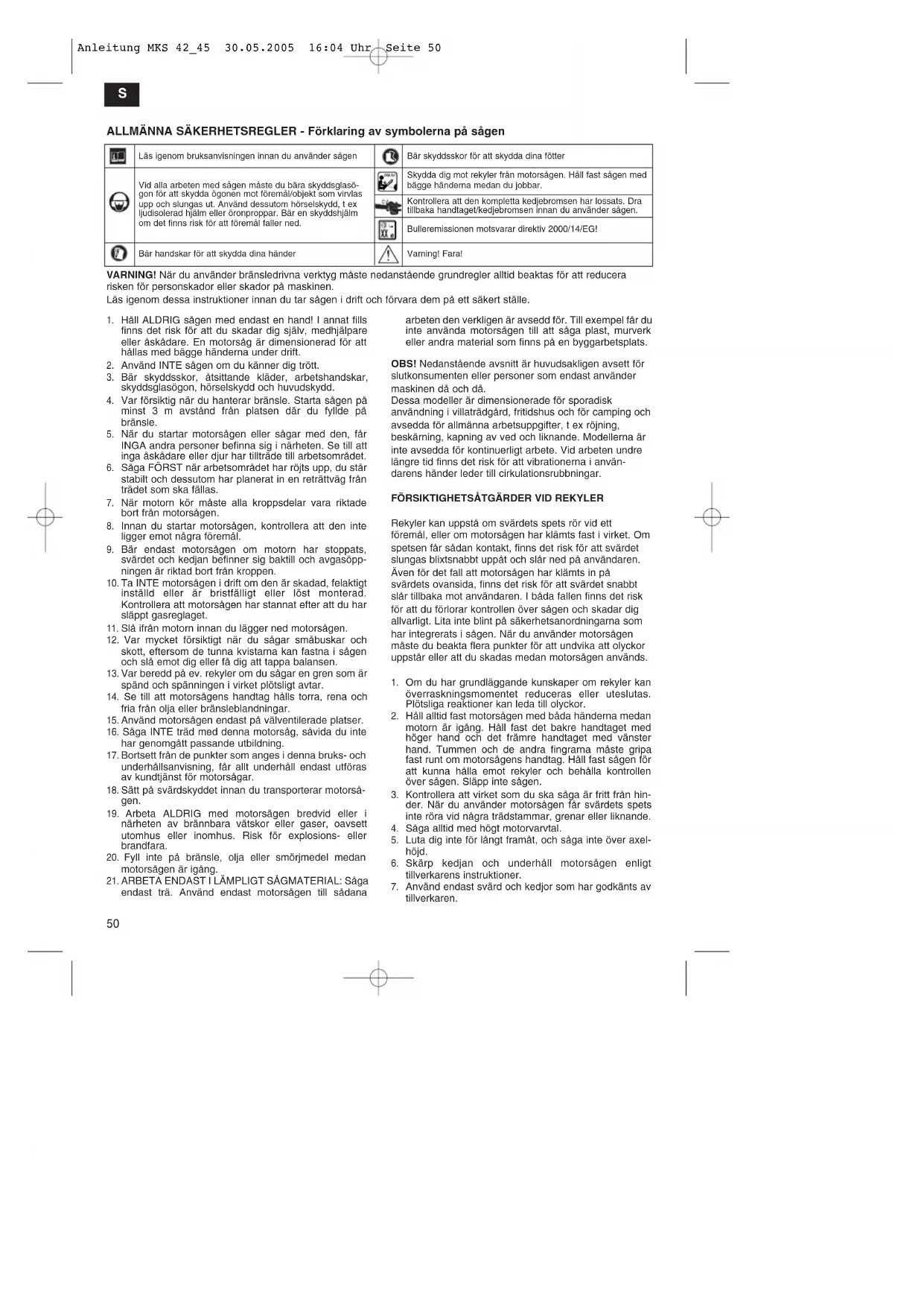 Läs igenom bruksanvisningen innan du använder sågen Vid alla arbeten med sågen måste du bära skyddsglasö- gon för att skydda ögonen mot föremål/objekt som virvlas upp och slungas ut. Använd dessutom hörselskydd, t ex ljudisolerad hjälm eller öronproppar. Bär en skyddshjälm om det finns risk för att föremål faller ned. Skydda dig mot rekyler från motorsågen. Håll fast sågen med bägge händerna medan du jobbar. Bär handskar för att skydda dina händer Bär skyddsskor för att skydda dina fötter Kontrollera att den kompletta kedjebromsen har lossats. Dra tillbaka handtaget/kedjebromsen innan du använder sågen. Bulleremissionen motsvarar direktiv 2000/14/EG! Varning! Fara! Anleitung MKS 42_45 30.05.2005 16:04 Uhr Seite 50S