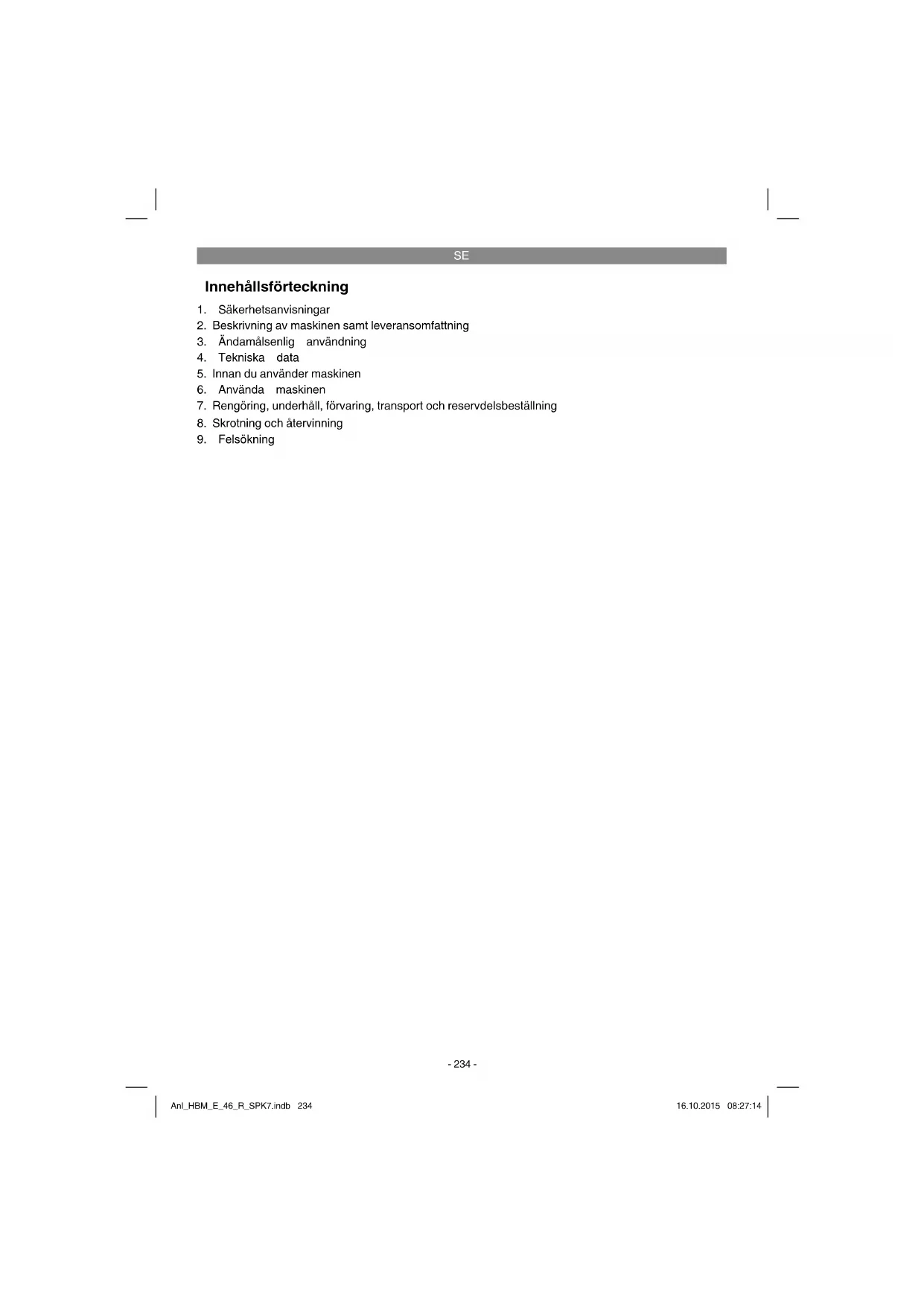 Slå ifrån maskinen om den inte används. Anl_HBM_E_46_R_SPK7.indb 236Anl_HBM_E_46_R_SPK7.indb 236 16.10.2015 08:27:1416.10.2015 08:27:14SE