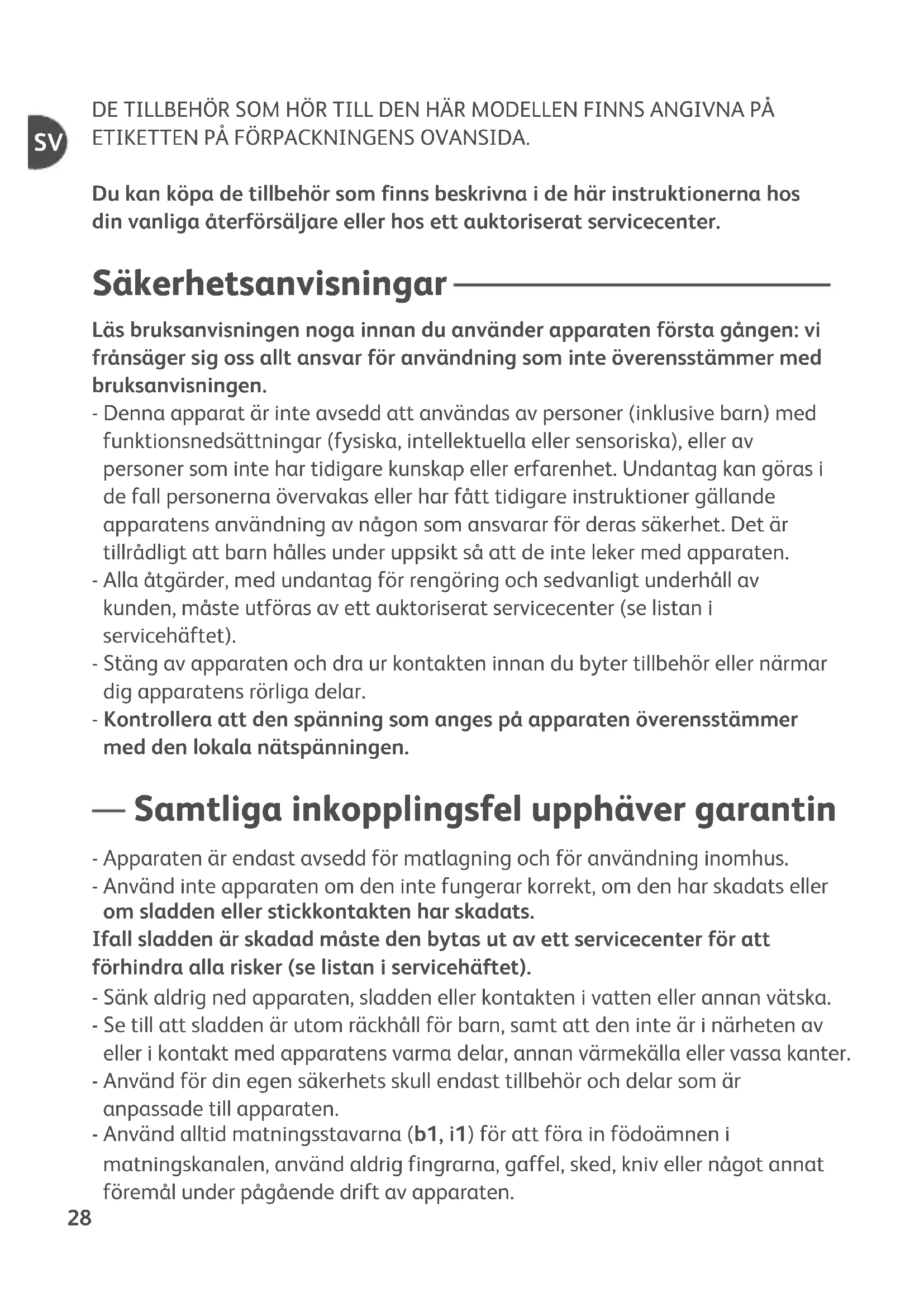 Apparatet inneholder mange materialer som kan gjenvinnes eller resirkuleres. Lever apparatet til en miljøstasjon når det ikke skal brukes mer. Gjenvinning av emballasjen og apparatet Emballasjen omfatter utelukkende miljøvennlige materialer som kan kastes i henhold til gjeldende bestemmelser om resirkulering. Når du skal kassere apparatet, må du henvende deg til riktig avdeling i din kommune.DE TILLBEHÖR SOM HÖR TILL DEN HÄR MODELLEN FINNS ANGIVNA PÅ ETIKETTEN PÅ FÖRPACKNINGENS OVANSIDA. Du kan köpa de tillbehör som finns beskrivna i de här instruktionerna hos din vanliga återförsäljare eller hos ett auktoriserat servicecenter. Säkerhetsanvisningar Läs bruksanvisningen noga innan du använder apparaten första gången: vi frånsäger sig oss allt ansvar för användning som inte överensstämmer med bruksanvisningen. - Denna apparat är inte avsedd att användas av personer (inklusive barn) med funktionsnedsättningar (fysiska, intellektuella eller sensoriska), eller av personer som inte har tidigare kunskap eller erfarenhet. Undantag kan göras i de fall personerna övervakas eller har fått tidigare instruktioner gällande apparatens användning av någon som ansvarar för deras säkerhet. Det är tillrådligt att barn hålles under uppsikt så att de inte leker med apparaten. - Alla åtgärder, med undantag för rengöring och sedvanligt underhåll av kunden, måste utföras av ett auktoriserat servicecenter (se listan i servicehäftet). - Stäng av apparaten och dra ur kontakten innan du byter tillbehör eller närmar dig apparatens rörliga delar. - Kontrollera att den spänning som anges på apparaten överensstämmer med den lokala nätspänningen. Samtliga inkopplingsfel upphäver garantin - Apparaten är endast avsedd för matlagning och för användning inomhus. - Använd inte apparaten om den inte fungerar korrekt, om den har skadats eller om sladden eller stickkontakten har skadats. Ifall sladden är skadad måste den bytas ut av ett servicecenter för att förhindra alla risker (se listan i servicehäftet). - Sänk aldrig ned apparaten, sladden eller kontakten i vatten eller annan vätska. - Se till att sladden är utom räckhåll för barn, samt att den inte är i närheten av eller i kontakt med apparatens varma delar, annan värmekälla eller vassa kanter. - Använd för din egen säkerhets skull endast tillbehör och delar som är anpassade till apparaten. - Använd alltid matningsstavarna (b1, i1) för att föra in födoämnen i matningskanalen, använd aldrig fingrarna, gaffel, sked, kniv eller något annat föremål under pågående drift av apparaten.