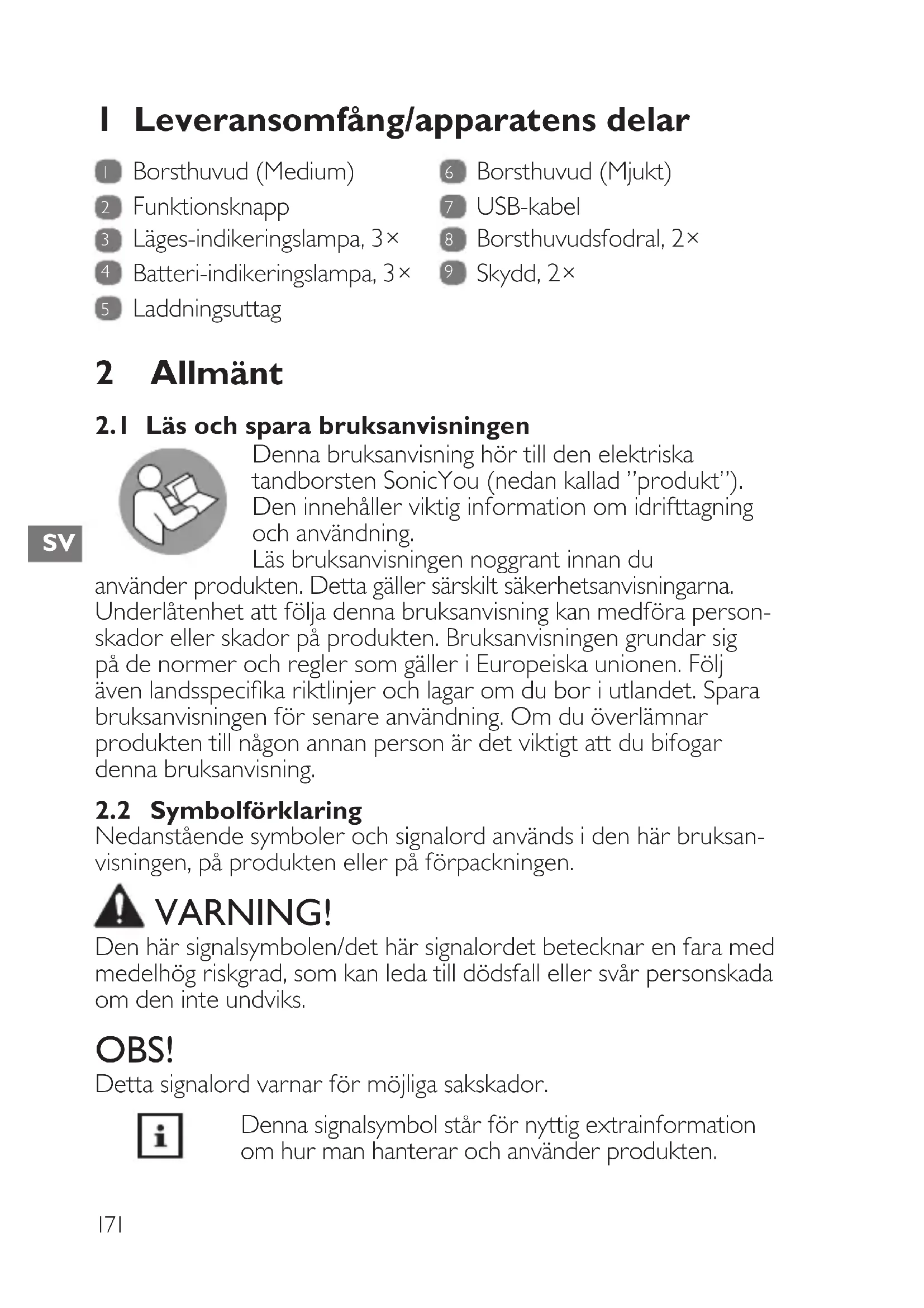 Nedanstående symboler och signalord används i den här bruksan- visningen, på produkten eller på förpackningen. VARNING! Den här signalsymbolen/det här signalordet betecknar en fara med medelhög riskgrad, som kan leda till dödsfall eller svår personskada om den inte undviks. OBS! Detta signalord varnar för möjliga sakskador. Denna signalsymbol står för nyttig extrainformation om hur man hanterar och använder produkten.172