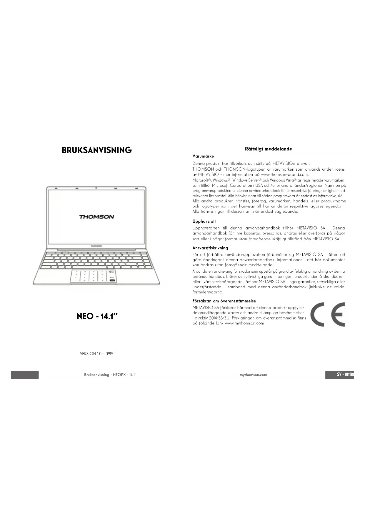 Vi anbefaler, at du gemmer denne mappe på et eksternt lagermedie (ekstern harddisk, USB-nøgler, CD-R) for at gemme en kopi af disse drivere.SV - 181180 - SV Bruksanvisning - NEOPX - 14.1’’ mythomson.com BRUKSANVISNING NEO - 14.1’’ VERSION 1.0 - 0919 Rättsligt meddelande Varumärke Denna produkt har tillverkats och sålts på METAVISIO:s ansvar. THOMSON och THOMSON-logotypen är varumärken som används under licens av METAVISIO - mer information på www.thomson-brand.com. Microsoft®, Windows®, Windows Server® och Windows Vista® är registrerade varumärken som tillhör Microsoft Corporation i USA och/eller andra länder/regioner. Namnen på programvaruprodukterna i denna användarhandbok tillhör respektive företag i enlighet med relevanta licensavtal. Alla hänvisningar till sådan programvara är endast av informativa skäl. Alla andra produkter, tjänster, företag, varumärken, handels- eller produktnamn och logotyper som det hänvisas till här är deras respektive ägares egendom. Alla hänvisningar till dessa namn är endast vägledande. Upphovsrätt Upphovsrätten till denna användarhandbok tillhör METAVISIO SA . Denna användarhandbok får inte kopieras, översättas, ändras eller överföras på något sätt eller i något format utan föregående skriftligt tillstånd från METAVISIO SA . Ansvarsfriskrivning För att förbättra användarupplevelsen förbehåller sig METAVISIO SA . rätten att göra ändringar i denna användarhandbok. Informationen i det här dokumentet kan ändras utan föregående meddelande. Användaren är ansvarig för skador som uppstår på grund av felaktig användning av denna användarhandbok. Utöver den uttryckliga garanti som ges i produktunderhållshandboken eller i vårt serviceåtagande, lämnar METAVISIO SA . inga garantier, uttryckliga eller underförstådda, i samband med denna användarhandbok (inklusive de valda formuleringarna). Försäkran om överensstämmelse METAVISIO SA förklarar härmed att denna produkt uppfyller de grundläggande kraven och andra tillämpliga bestämmelser i direktiv 2014/53/EU. Förklaringen om överensstämmelse nns på följande länk www.mythomson.comSV - 183182 - SV Bruksanvisning - NEOPX - 14.1’’ mythomson.com - Viktiga säkerhetsanvisningar - Den här enheten ska användas i en miljö där den omgivande temperaturen ligger mellan 5 °C (41 °F) och 35 °C (95 °F). Utsätt inte enheten för regn eller fukt och håll den borta från vätskor. Om vatten eller andra vätskor spillts på enheten ska du omedelbart stänga av strömmen och vänta tills enheten är helt torr innan du slår på den igen. Utsätt inte enheten för direkt solljus. Använd inte starka lösningsmedel, ytande rengöringsmedel eller andra kemikalier på eller nära enhetens yta för att undvika korrosion eller skador på enhetens yta. Utsätt inte enheten för en dammig miljö. Använd inte enheten under en gasläcka. Utsätt inte enheten för starka magnetiska eller elektriska fält. Du kan passera enheten genom ygplatsernas röntgendetektorer. Det rekommenderas dock att du inte låter enheten passera genom magnetiska detektorportaler eller utsätter den för handhållna detektorer. Placera inga föremål på enheten. Placera inte apparaten på en ojämn eller instabil yta. Se till att skydda enheten från att tappas eller skadas på annat sätt. Låt inte enheten vara påslagen eller laddas på ditt knä eller någon annan kroppsdel för att undvika värmerelaterade skador. Stäng av enheten innan du transporterar den eller täcker den med något material som inte tillåter optimal luftcirkulation. Använd inte skadade nätsladdar, tillbehör eller andra enheter tillsammans med enheten. Vi rekommenderar att du endast använder de tillbehör (nätaggregat, kablar etc.) som medföljer enheten. Använd endast originalbatterier. Om du byter ut batteriet mot ett felaktigt batteri kan det leda till explosionsrisk. Demontera, modiera eller reparera inte enheten själv, eftersom detta kan göra garantin ogiltig. Säkerhetskopiera ditt viktiga innehåll regelbundet för att undvika dataförlust. Vårt företag tar inget ansvar för förlust eller radering av objekt som nns i enheten till följd av felaktig användning av hårdvara eller programvara, bristande underhåll eller någon annan oavsiktlig händelse. Denna produkt har utformats för att möjliggöra korrekt återvinning av delar och komponenter. Symbolen med den överstrukna papperskorgen visar att apparaten inte får slängas med kommunalt avfall. Se de lokala bestämmelserna för bortskaffande av elektronisk utrustning. Symbolen med den överkryssade papperskorgen visar att batteriet inte får slängas med kommunalt avfall. Se de lokala bestämmelserna för bortskaffande av batterier. För att undvika eventuella hörselskador bör du inte lyssna på höga ljudnivåer under långa perioder.SV - 185184 - SV Bruksanvisning - NEOPX - 14.1’’ mythomson.com - Presentation av anordningen - Framifrån Vänster vy Höger vy Obs : Enhetens layout och vissa funktioner kan variera beroende på land, modell eller version.