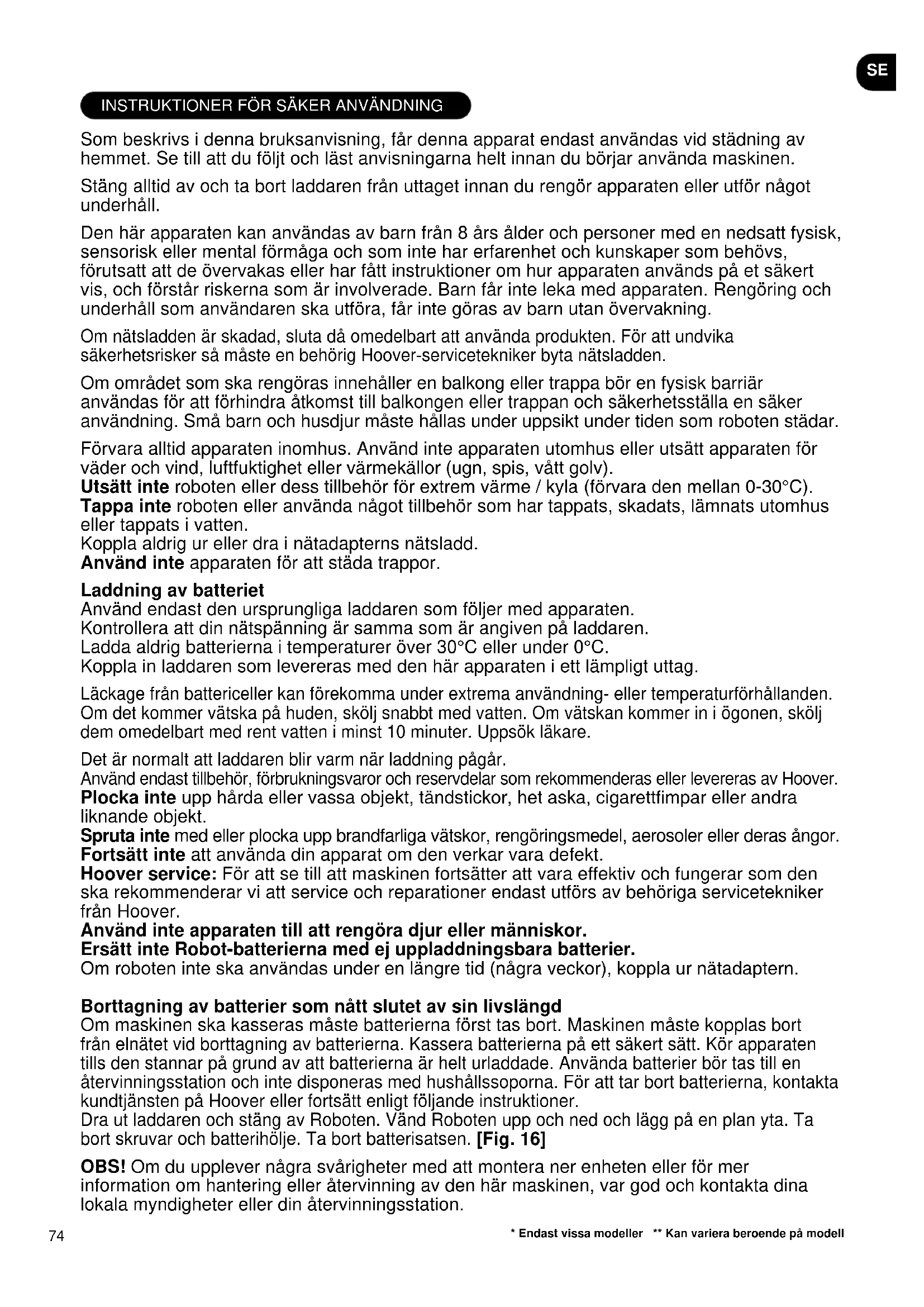 - Moppefunksjonen virker ikke Kontroller at det er nok rent vann i vanntanken. Kontroller at klutfestet med kluten er korrekt montert i roboten. NO74 INSTRUKTIONER FÖR SÄKER ANVÄNDNING Som beskrivs i denna bruksanvisning, får denna apparat endast användas vid städning av hemmet. Se till att du följt och läst anvisningarna helt innan du börjar använda maskinen. Stäng alltid av och ta bort laddaren från uttaget innan du rengör apparaten eller utför något underhåll. Den här apparaten kan användas av barn från 8 års ålder och personer med en nedsatt fysisk, sensorisk eller mental förmåga och som inte har erfarenhet och kunskaper som behövs, förutsatt att de övervakas eller har fått instruktioner om hur apparaten används på et säkert vis, och förstår riskerna som är involverade. Barn får inte leka med apparaten. Rengöring och underhåll som användaren ska utföra, får inte göras av barn utan övervakning. Om nätsladden är skadad, sluta då omedelbart att använda produkten. För att undvika säkerhetsrisker så måste en behörig Hoover-servicetekniker byta nätsladden. Om området som ska rengöras innehåller en balkong eller trappa bör en fysisk barriär användas för att förhindra åtkomst till balkongen eller trappan och säkerhetsställa en säker användning. Små barn och husdjur måste hållas under uppsikt under tiden som roboten städar. Förvara alltid apparaten inomhus. Använd inte apparaten utomhus eller utsätt apparaten för väder och vind, luftfuktighet eller värmekällor (ugn, spis, vått golv). Utsätt inte roboten eller dess tillbehör för extrem värme / kyla (förvara den mellan 0-30°C). Tappa inte roboten eller använda något tillbehör som har tappats, skadats, lämnats utomhus eller tappats i vatten. Koppla aldrig ur eller dra i nätadapterns nätsladd. Använd inte apparaten för att städa trappor. Laddning av batteriet Använd endast den ursprungliga laddaren som följer med apparaten. Kontrollera att din nätspänning är samma som är angiven på laddaren. Ladda aldrig batterierna i temperaturer över 30°C eller under 0°C. Koppla in laddaren som levereras med den här apparaten i ett lämpligt uttag. Läckage från battericeller kan förekomma under extrema användning- eller temperaturförhållanden. Om det kommer vätska på huden, skölj snabbt med vatten. Om vätskan kommer in i ögonen, skölj dem omedelbart med rent vatten i minst 10 minuter. Uppsök läkare. Det är normalt att laddaren blir varm när laddning pågår. Använd endast tillbehör, förbrukningsvaror och reservdelar som rekommenderas eller levereras av Hoover. Plocka inte upp hårda eller vassa objekt, tändstickor, het aska, cigarettmpar eller andra liknande objekt. Spruta inte med eller plocka upp brandfarliga vätskor, rengöringsmedel, aerosoler eller deras ångor. Fortsätt inte att använda din apparat om den verkar vara defekt. Hoover service: För att se till att maskinen fortsätter att vara effektiv och fungerar som den ska rekommenderar vi att service och reparationer endast utförs av behöriga servicetekniker från Hoover. Använd inte apparaten till att rengöra djur eller människor. Ersätt inte Robot-batterierna med ej uppladdningsbara batterier. Om roboten inte ska användas under en längre tid (några veckor), koppla ur nätadaptern. Borttagning av batterier som nått slutet av sin livslängd Om maskinen ska kasseras måste batterierna först tas bort. Maskinen måste kopp las bort från elnätet vid borttagning av batterierna. Kassera batterierna på ett säkert sätt. Kör apparaten tills den stannar på grund av att batterierna är helt urladdade. Använda batterier bör tas till en återvinningsstation och inte disponeras med hushållssoporna. För att tar bort batterierna, kontakta kundtjänsten på Hoover eller fortsätt enligt följande instruktioner. Dra ut laddaren och stäng av Roboten. Vänd Roboten upp och ned och lägg på en plan yta. Ta bort skruvar och batterihölje. Ta bort batterisatsen. [Fig. 16] OBS! Om du upplever några svårigheter med att montera ner enheten eller för mer information om hantering eller återvinning av den här maskinen, var god och kontakta dina lokala myndigheter eller din återvinningsstation.