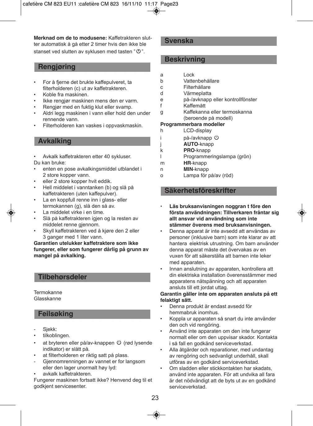 • Détartrez votre cafetière tous les 40 cycles. Vous pouvez utiliser. • soit un sachet de détartrant dilué dans 2 grandes tasses d’eau. • soit 2 grandes tasses de vinaigre d’alcool blanc. • Verser dans le réservoir (b) et mettre la cafetière en marche (sans mouture). • Laisser couler dans la verseuse ou le pot isotherme (g) l’équivalent d’une tasse, puis arrêter. • Laisser agir pendant une heure. • Remettre la cafetière en marche pour terminer l’écoulement. • Rincer la cafetière en la faisant fonctionner 2 ou 3 fois avec 1 litre d’eau. La garantie exclut les cafetières ne fonctionnant pas ou mal par absence de détartrage.