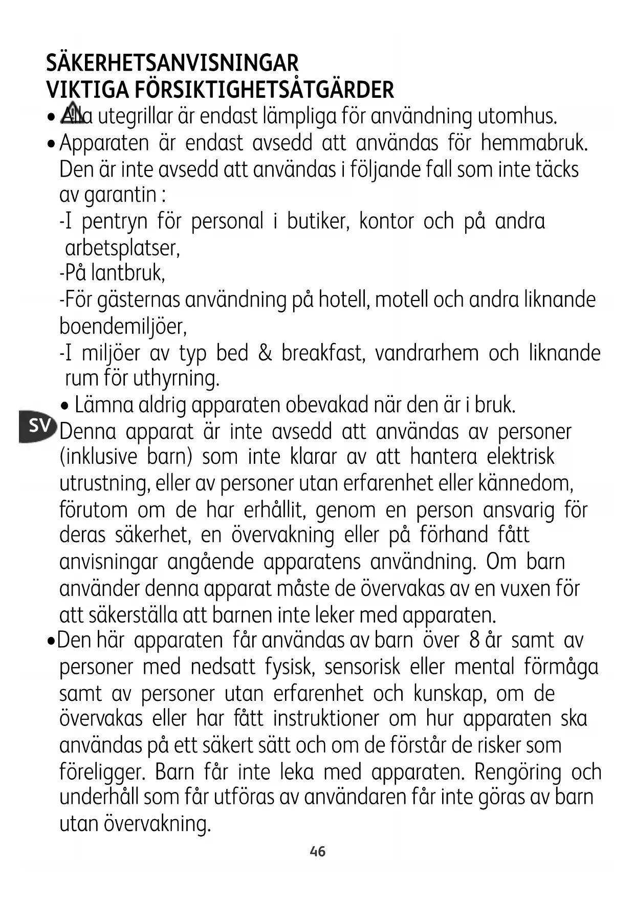 - Den här apparaten får användas av barn över 8 år samt av personer med nedsatt fysisk, sensorisk eller mental förmåga samt av personer utan erfarenhet och kunskap, om de övervakas eller har fått instruktioner om hur apparaten ska användas på ett säkert sätt och om de förstår de risker som föreligger. Barn får inte leka med apparaten. Rengöring och underhåll som får utföras av användaren får inte göras av barn utan övervakning.